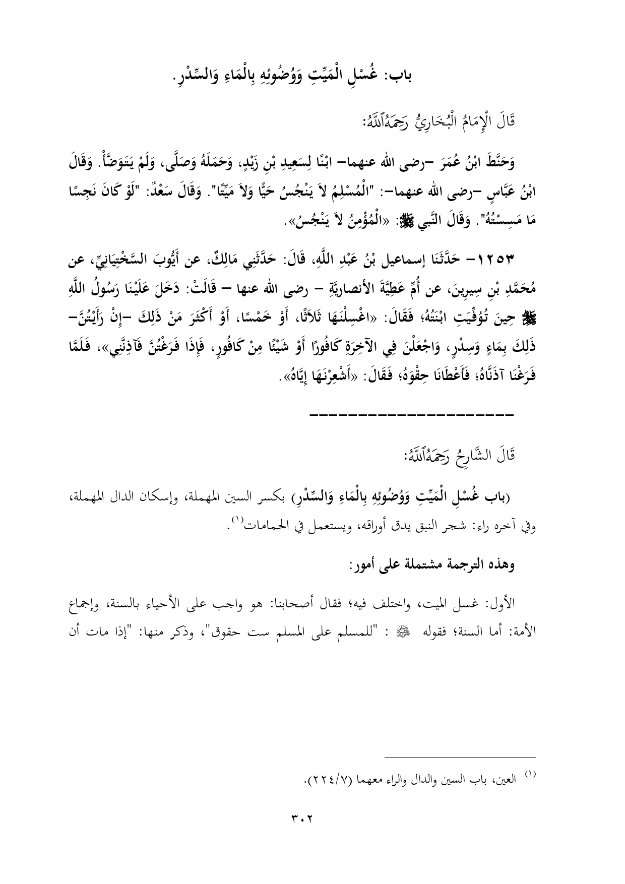 باب: غُسْلِ الْمَيِّتِ وَوُضُوئِهِ بِالْمَاءِ وَالسِّدْرِ.
