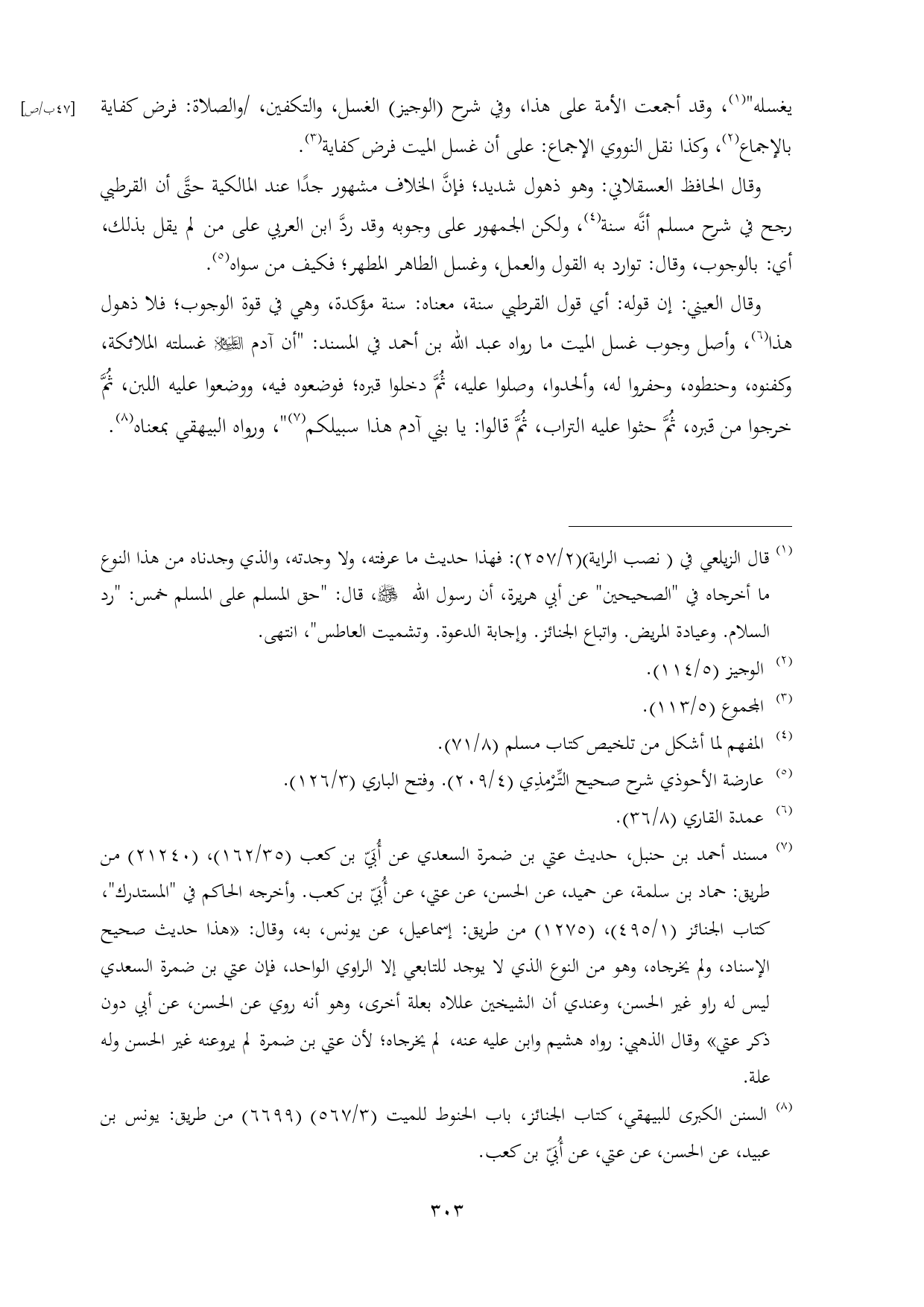 وقال الحافظ العسقلاني: وهو ذهول شديد؛ فإنَّ الخلاف مشهور جدًا عند المالكية حتَّى أن القرطبي رجح في شرح مسلم أنَّه سنة (¬٤)، ولكن الجمهور على وجوبه وقد ردَّ ابن العربي على من لم يقل بذلك، أي: بالوجوب، وقال: توارد به القول والعمل، وغسل الطاهر المطهر؛ فكيف من سواه (¬٥).