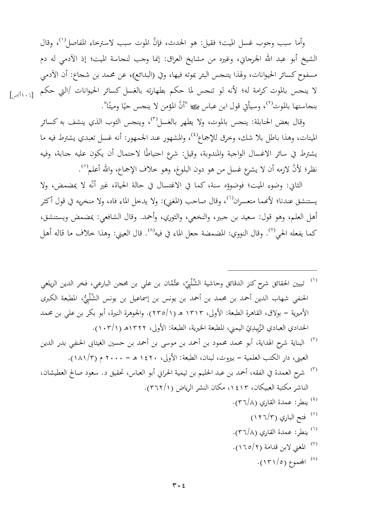 وقال بعض الحنابلة: ينجس بالموت، ولا يطهر بالغسل (¬٣)، وينجس الثوب الذي ينشف به كسائر الميتات، وهذا باطل بلا شك، وخرق للإجماع (¬٤)، والمشهور عند الجمهور: أنه غسل تعبدي يشترط فيه ما يشترط في سائر الاغسال الواجبة والمندوبة، وقيل: شرع احتياطًا لاحتمال أن يكون عليه جنابة، وفيه نظر؛ لأنَّ لازمه أن لا يشرع غسل من هو دون البلوغ، وهو خلاف الإجماع، والله أعلم (¬٥).