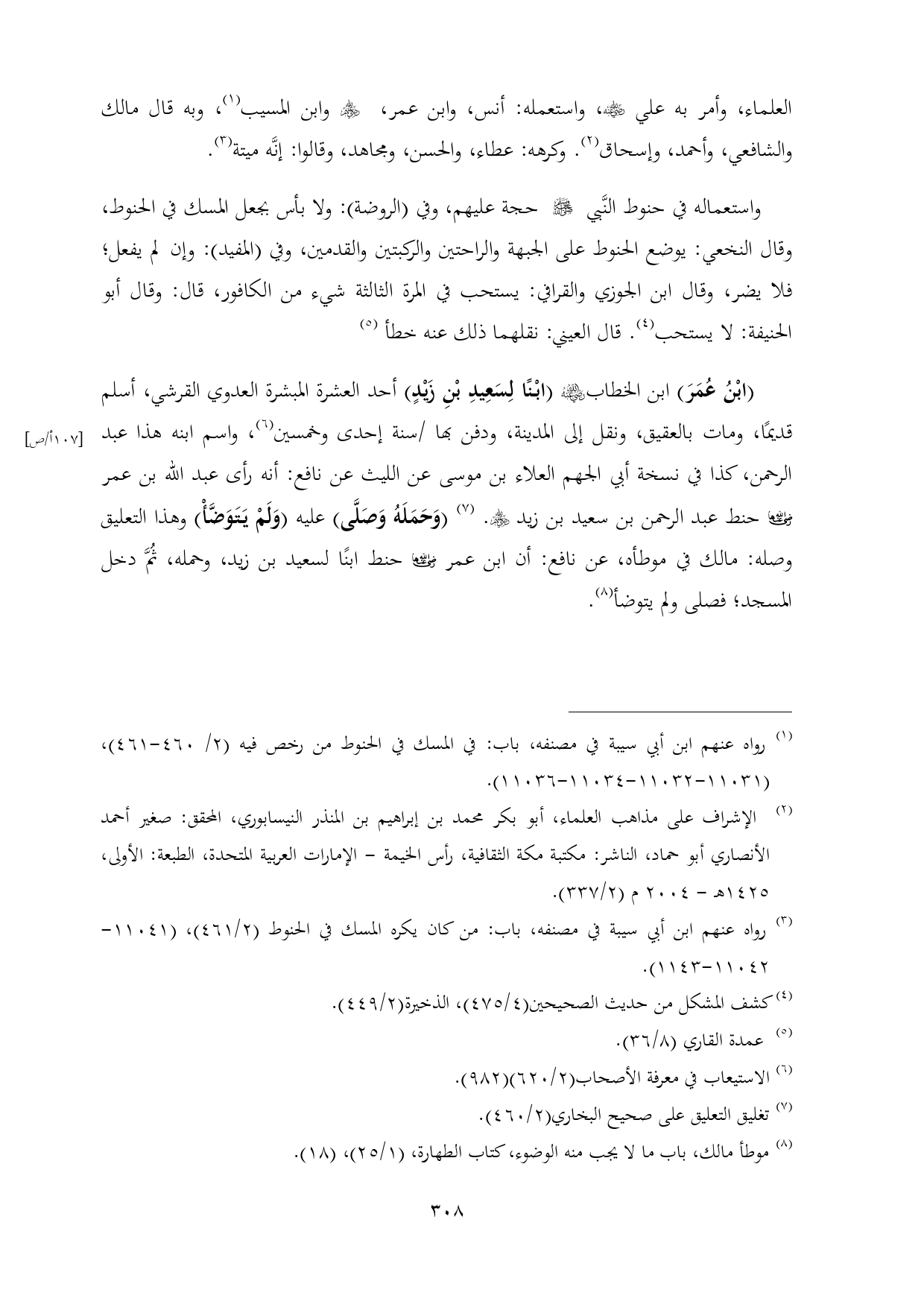 (¬١) رواه عنهم ابن أبي سيبة في مصنفه، باب: في المسك في الحنوط من رخص فيه (٢/ ٤٦٠ - ٤٦١)، (١١٠٣١ - ١١٠٣٢ - ١١٠٣٤ - ١١٠٣٦).