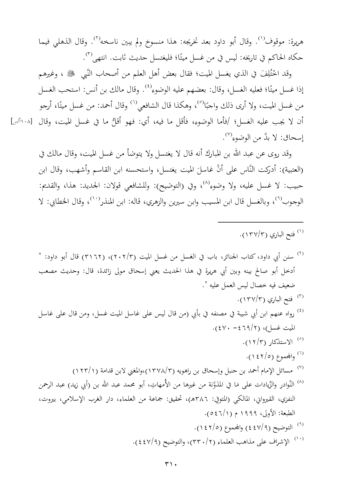 هريرة: موقوف (¬١). وقال أبو داود بعد تخريجه: هذا منسوخ ولم يبين ناسخه (¬٢). وقال الذهلي فيما حكاه الحاكم في تاريخه: ليس في من غسل ميتًا؛ فليغتسل حديث ثابت. انتهى (¬٣).