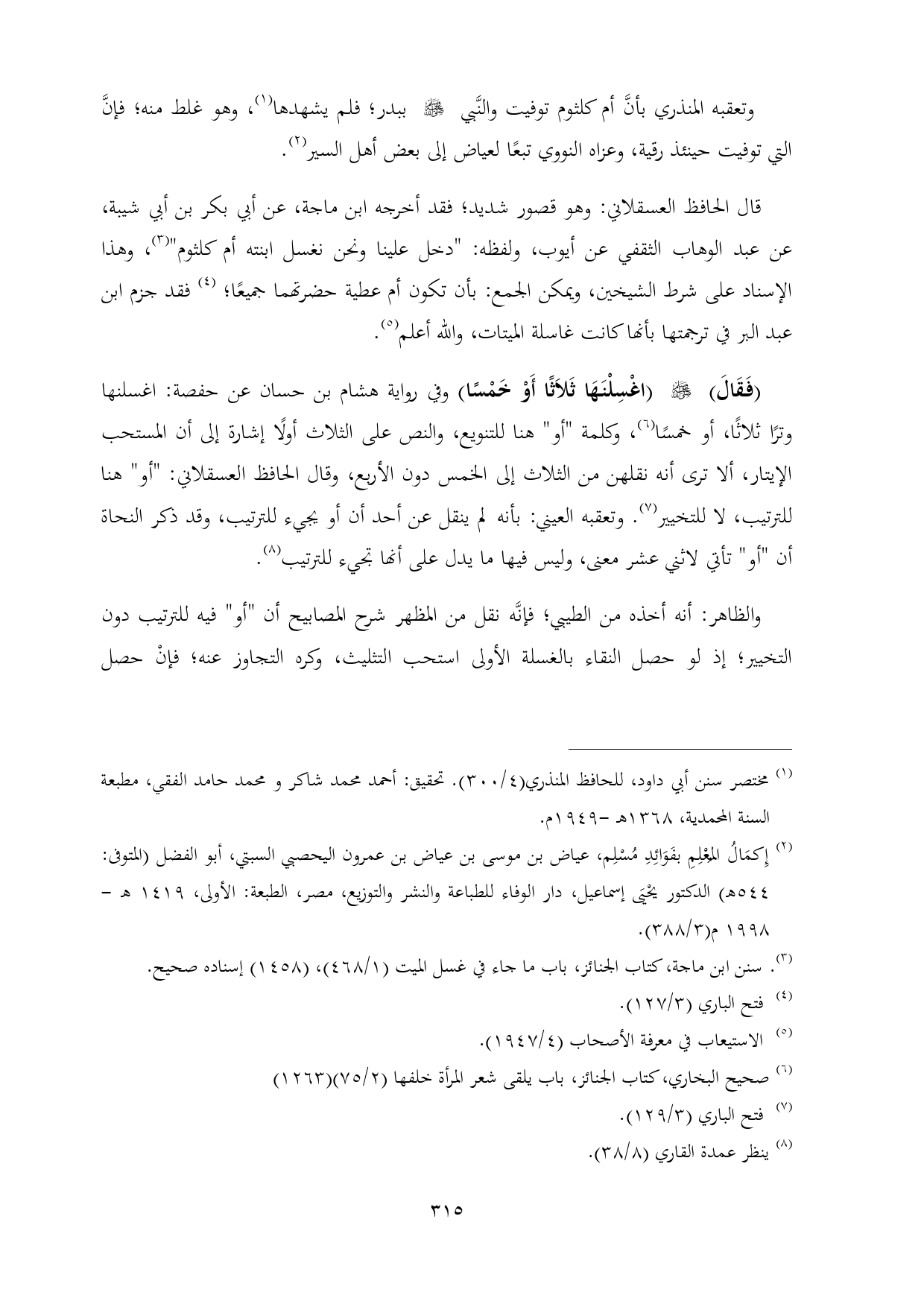 قال الحافظ العسقلاني: وهو قصور شديد؛ فقد أخرجه ابن ماجة، عن أبي بكر بن أبي شيبة، عن عبد الوهاب الثقفي عن أيوب، ولفظه: "دخل علينا ونحن نغسل ابنته أم كلثوم" (¬٣)، وهذا الإسناد على شرط الشيخين، ويمكن الجمع: بأن تكون أم عطية حضرتهما جميعًا؛ (¬٤) فقد جزم ابن عبد البر في ترجمتها بأنها كانت غاسلة الميتات، والله أعلم (¬٥).