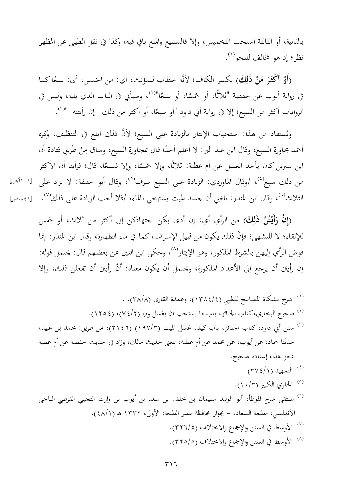 (أَوْ أَكْثَرَ مَنْ ذَلِكَ) بكسر الكاف؛ لأنَّه خطاب للمؤنث، أي: من الخمس، أي: سبعًا كما في رواية أيوب عن حفصة "ثلاثًا، أو خمسًا، أو سبعًا" (¬٢)، وسيأتي في الباب الذي يليه، وليس في الروايات أكثر من السبع؛ إلا في رواية أبي داود "أو سبعًا، أو أكثر من ذلك -إن رأيتنه-" (¬٣).
