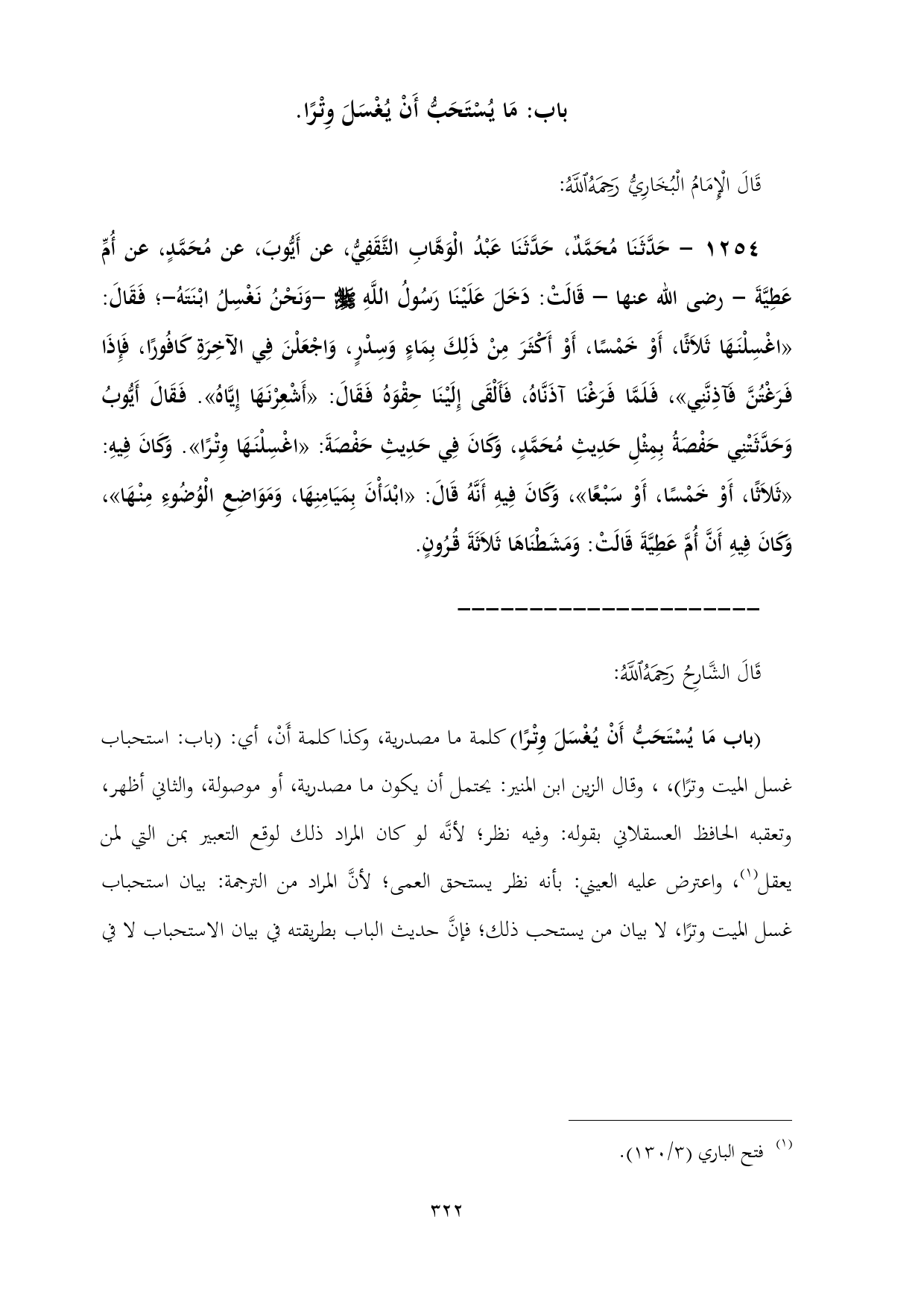(باب مَا يُسْتَحَبُّ أَنْ يُغْسَلَ وِتْرًا) كلمة ما مصدرية، وكذا كلمة أَنْ، أي: (باب: استحباب غسل الميت وترًا)،، وقال الزين ابن المنير: يحتمل أن يكون ما مصدرية، أو موصولة، والثاني أظهر، وتعقبه الحافظ العسقلاني بقوله: وفيه نظر؛ لأنَّه لو كان المراد ذلك لوقع التعبير بمن التي لمن يعقل (¬١)، واعترض عليه العيني: بأنه نظر يستحق العمى؛ لأنَّ المراد من الترجمة: بيان استحباب غسل الميت وترًا، لا بيان من يستحب ذلك؛ فإنَّ حديث الباب بطريقته في بيان الاستحباب لا في