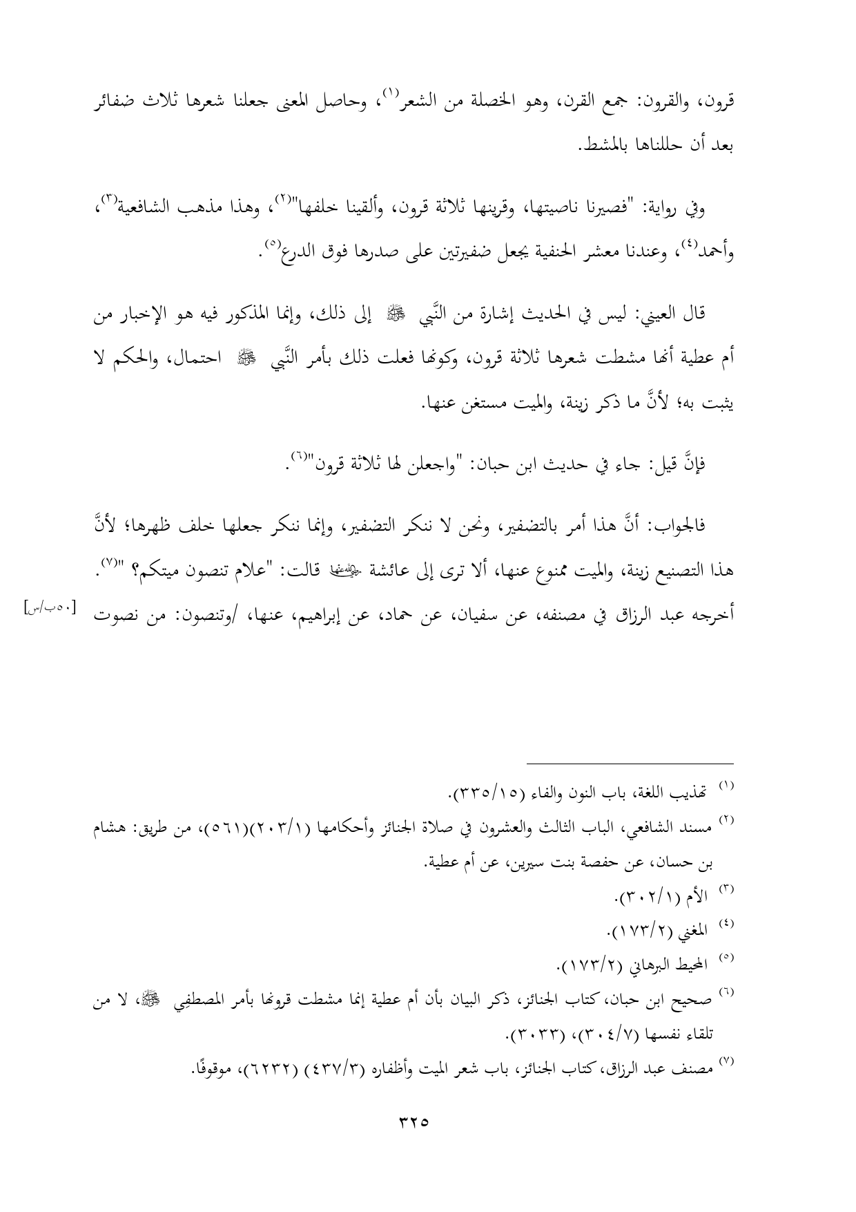 فالجواب: أنَّ هذا أمر بالتضفير، ونحن لا ننكر التضفير، وإنما ننكر جعلها خلف ظهرها؛ لأنَّ هذا التصنيع زينة، والميت ممنوع عنها، ألا ترى إلى عائشة - رضي الله عنها - قالت: "علام تنصون ميتكم؟ " (¬٧). أخرجه عبد الرزاق في مصنفه، عن سفيان، عن حماد، عن إبراهيم، عنها، /وتنصون: من نصوت