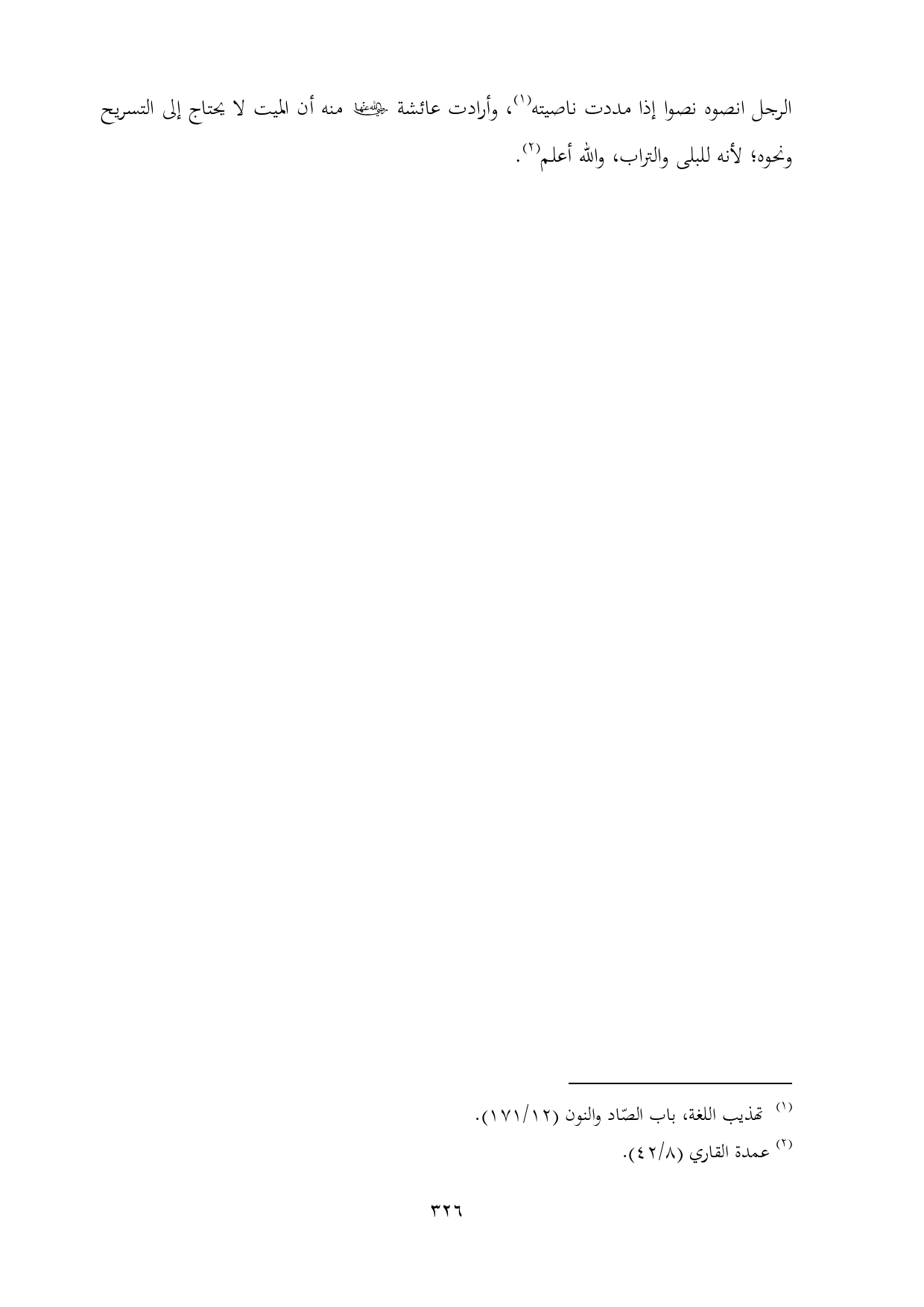 الرجل انصوه نصوا إذا مددت ناصيته (¬١)، وأرادت عائشة - رضي الله عنها - منه أن الميت لا يحتاج إلى التسريح ونحوه؛ لأنه للبلى والتراب، والله أعلم (¬٢).