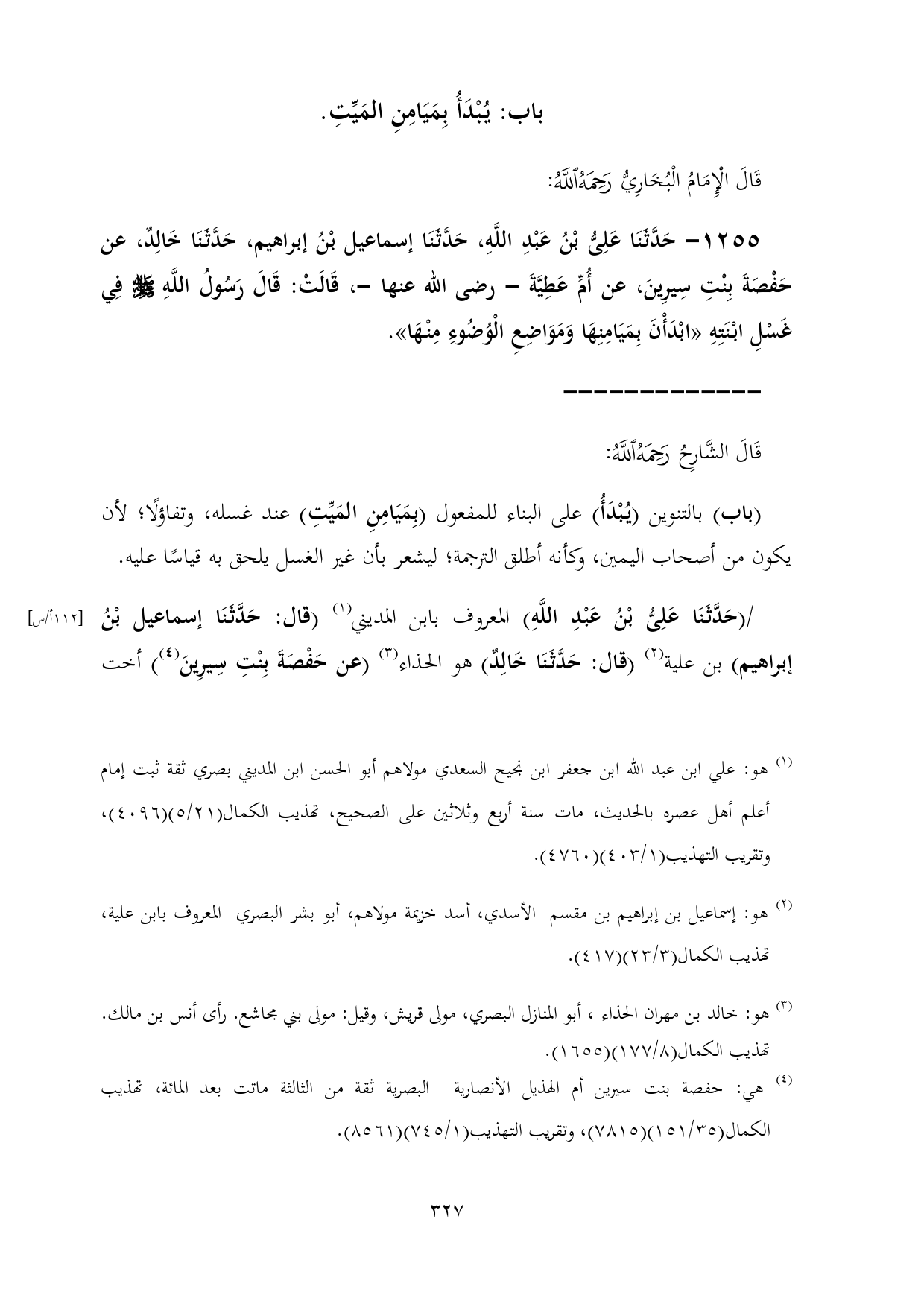 ١٢٥٥ - حَدَّثَنَا عَلِىُّ بْنُ عَبْدِ اللَّهِ، حَدَّثَنَا إسماعيل بْنُ إبراهيم، حَدَّثَنَا خَالِدٌ، عن حَفْصَةَ بِنْتِ سِيرِينَ، عن أُمِّ عَطِيَّةَ - رضى الله عنها -، قَالَتْ: قَالَ رَسُولُ اللَّهِ - صلى الله عليه وسلم - فِي غَسْلِ ابْنَتِهِ «ابْدَأْنَ بِمَيَامِنِهَا وَمَوَاضِعِ الْوُضُوءِ مِنْهَا».