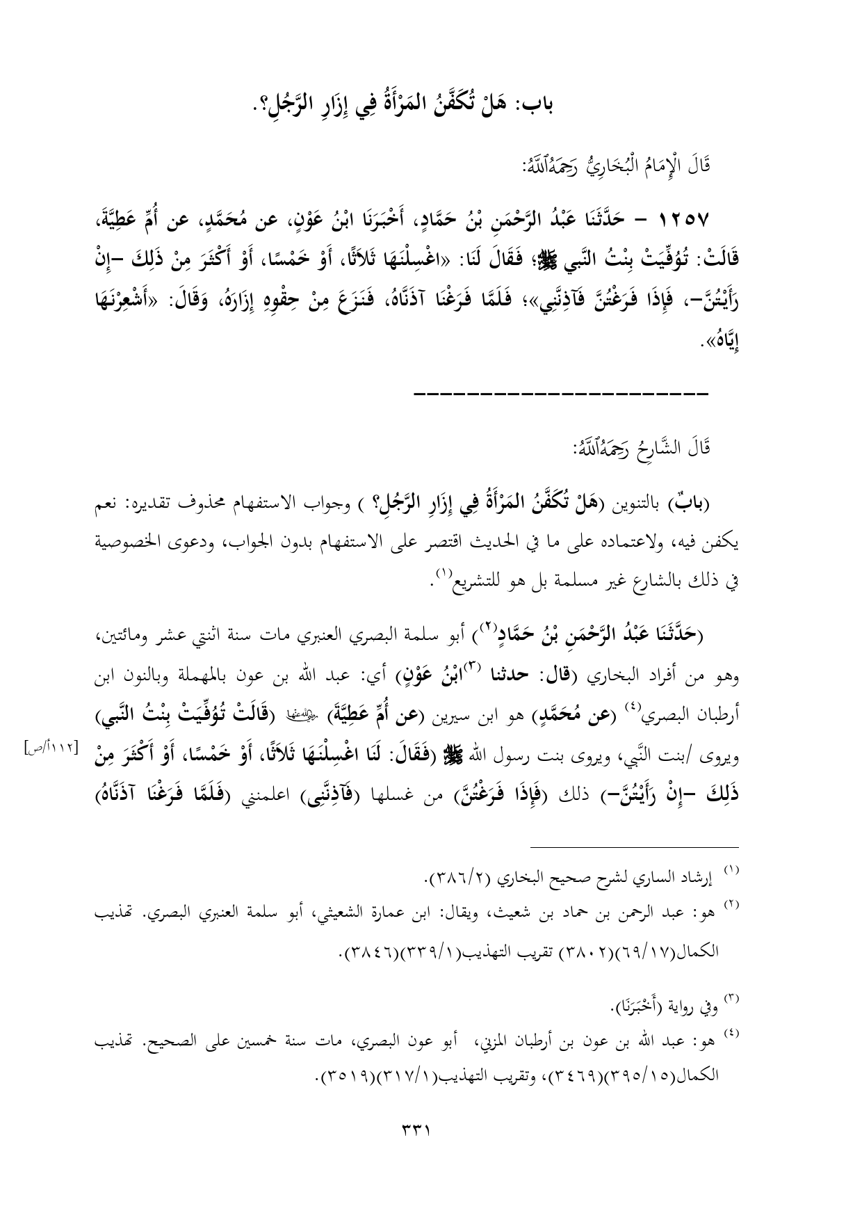 (حَدَّثَنَا عَبْدُ الرَّحْمَنِ بْنُ حَمَّادٍ (¬٢)) أبو سلمة البصري العنبري مات سنة اثنتي عشر ومائتين، وهو من أفراد البخاري (قال: حدثنا (¬٣) ابْنُ عَوْنٍ) أي: عبد الله بن عون بالمهملة وبالنون ابن أرطبان البصري (¬٤) (عن مُحَمَّدٍ) هو ابن سيرين (عن أُمِّ عَطِيَّةَ) - رضي الله عنها - (قَالَتْ تُوُفِّيَتْ بِنْتُ النَّبي) ويروى /بنت النَّبي، ويروى بنت رسول الله - صلى الله عليه وسلم - (فَقَالَ: لَنَا اغْسِلْنَهَا ثَلَاثًا، أَوْ خَمْسًا، أَوْ أَكْثَرَ مِنْ ذَلِكَ -إِنْ رَأَيْتُنَّ-) ذلك (فَإِذَا فَرَغْتُنَّ) من غسلها (فَآذِنَّنِى) اعلمنني