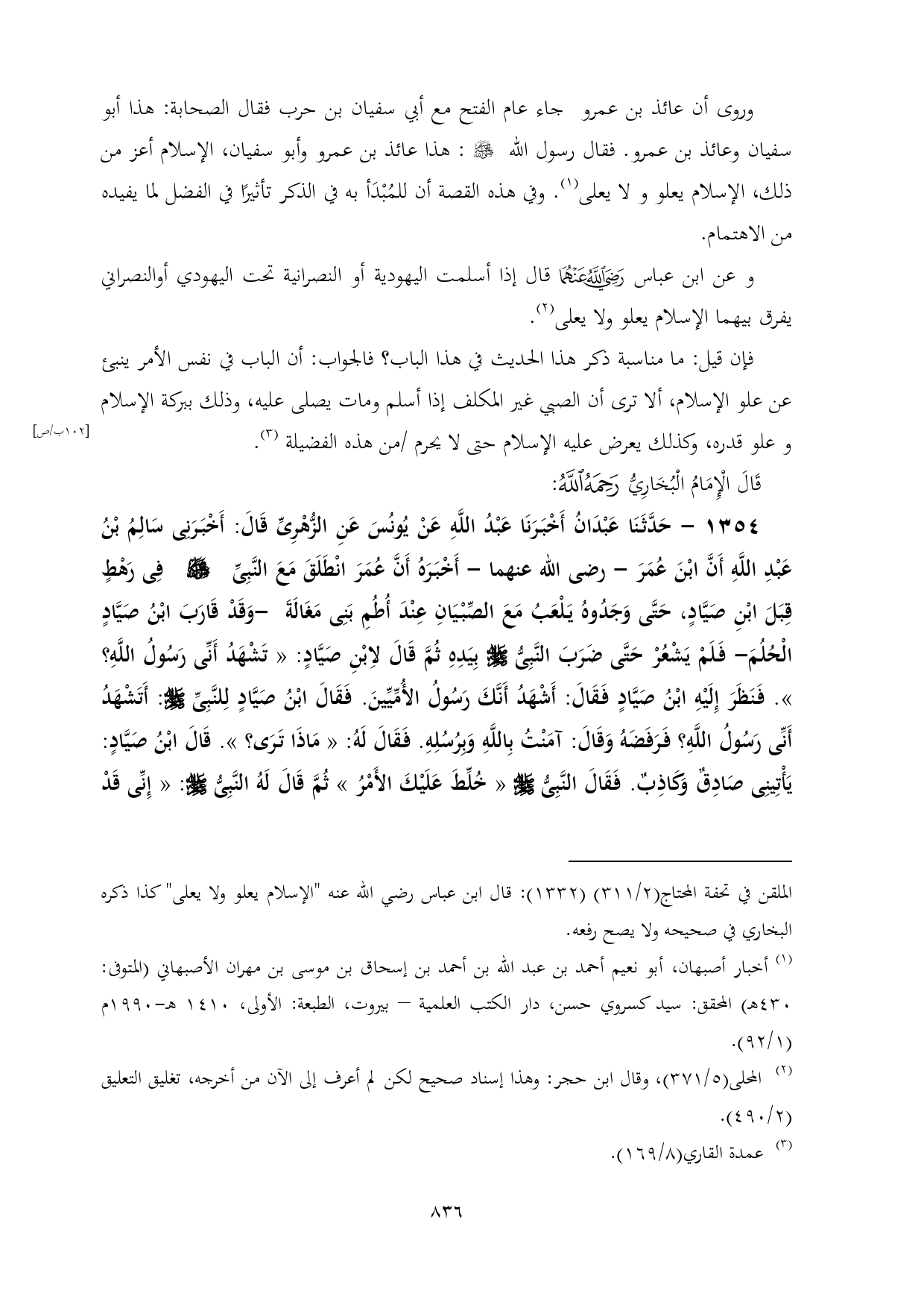 فإن قيل: ما مناسبة ذكر هذا الحديث في هذا الباب؟ فالجواب: أن الباب في نفس الأمر ينبئ عن علو الإسلام، ألا ترى أن الصبي غير المكلف إذا أسلم ومات يصلى عليه، وذلك ببركة الإسلام وعلو قدره، وكذلك يعرض عليه الإسلام حتى لا يحرم /من هذه الفضيلة (¬٣).
