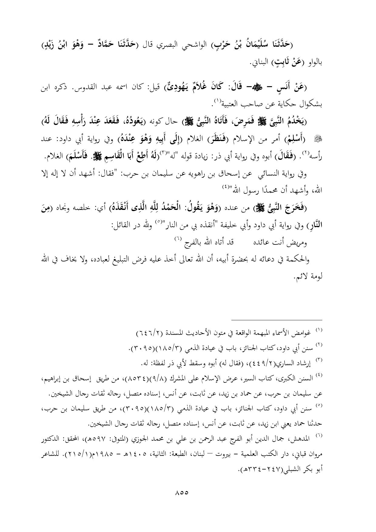 (¬٥) سنن أبي داود، كتاب الجنائز، باب في عيادة الذمي (٣/ ١٨٥) (٣٠٩٥)، من طريق سليمان بن حرب، حدثنا حماد يعني ابن زيد، عن ثابت، عن أنس، إسناده متصل، رجاله ثقات رجال الشيخين.