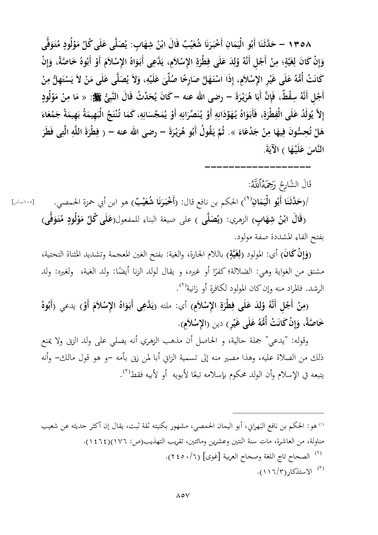 وقوله: "يدعي" جملة حالية, والحاصل أن مذهب الزهري أنه يصلي على ولد الزنى ولا يمنع ذلك من الصلاة عليه, وهذا مصير منه إلى تسمية الزاني أبا لمن زنى بأمه -وهو قول مالك- وأنه يتبعه في الإسلام وأن الولد محكوم بإسلامه تبعًا لأبويه أو لأبيه فقط (¬٣).