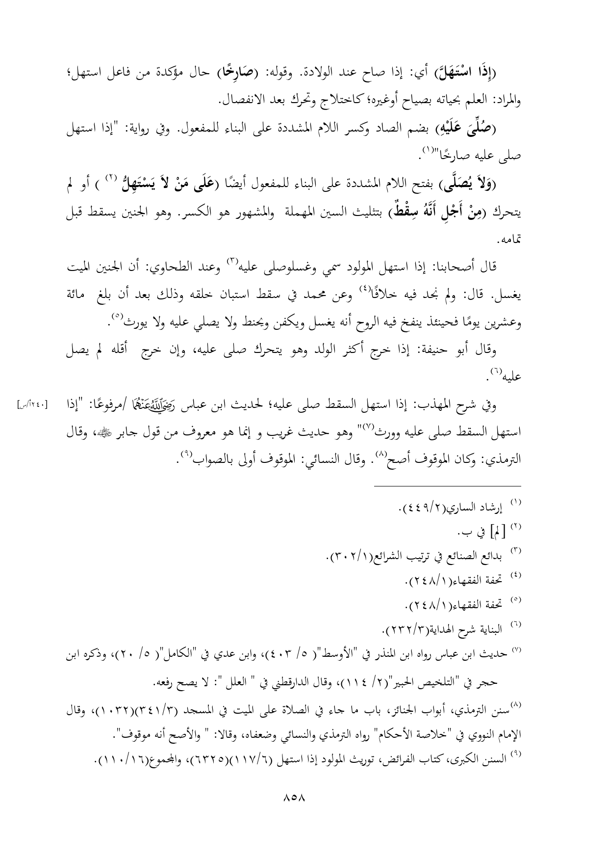 (¬٩) السنن الكبرى، كتاب الفرائض، توريث المولود إذا استهل (٦/ ١١٧) (٦٣٢٥)، والمجموع (١٦/ ١١٠).