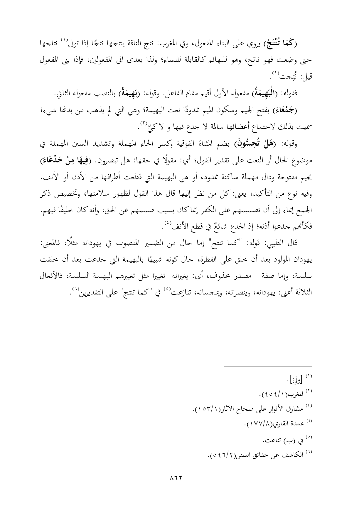 قال الطيبي: قوله: "كما تنتج" إما حال من الضمير المنصوب في يهودانه مثلًا، فالمعنى: يهودان المولود بعد أن خلق على الفطرة, حال كونه شبيهًا بالبهيمة التي جدعت بعد أن خلقت