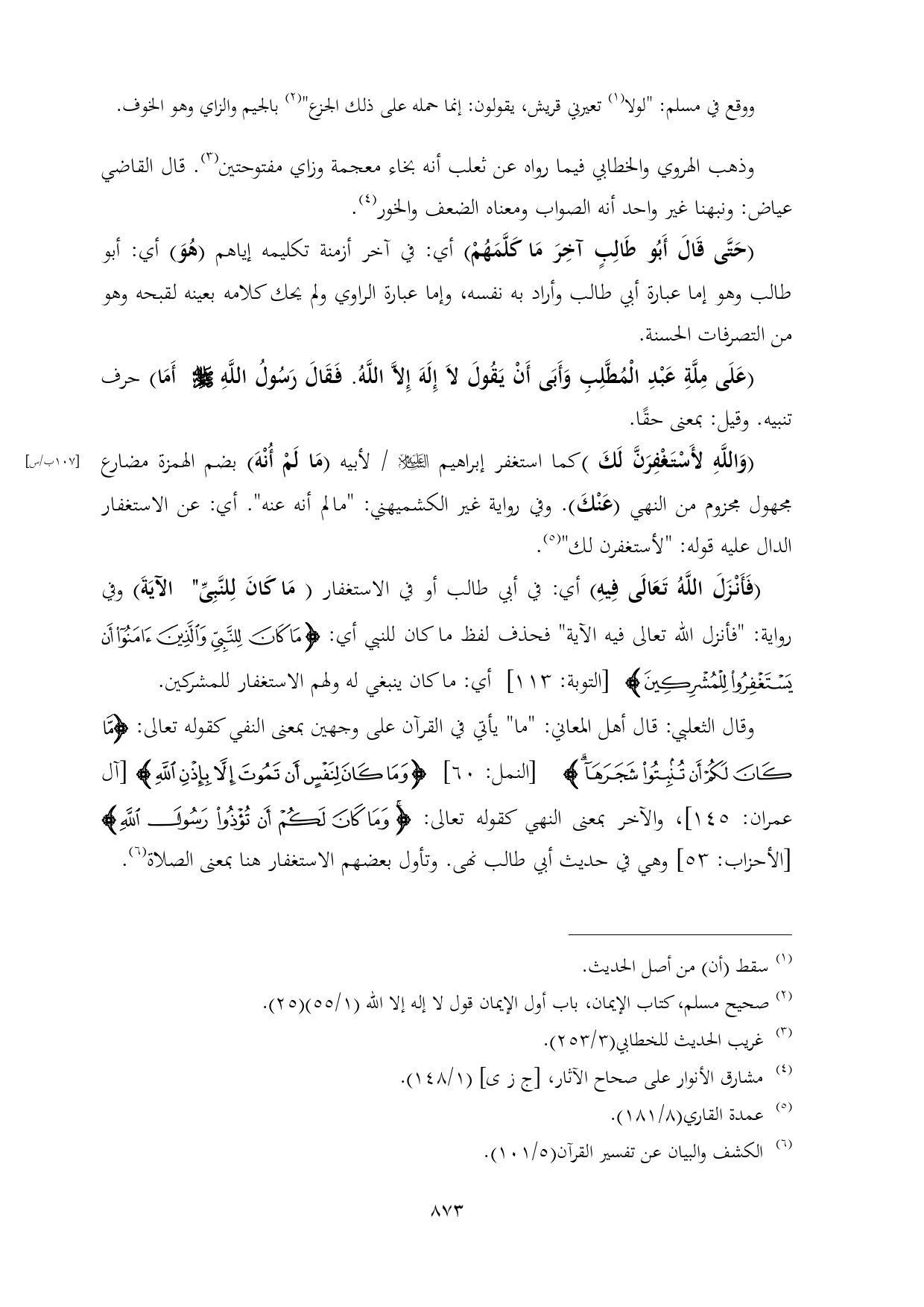 عمران: ١٤٥]، والآخر بمعنى النهي كقوله تعالى: {وَمَا كَانَ لَكُمْ أَنْ تُؤْذُوا رَسُولَ اللَّهِ} [الأحزاب: ٥٣] وهي في حديث أبي طالب نهى. وتأول بعضهم الاستغفار هنا بمعنى الصلاة (¬٦).