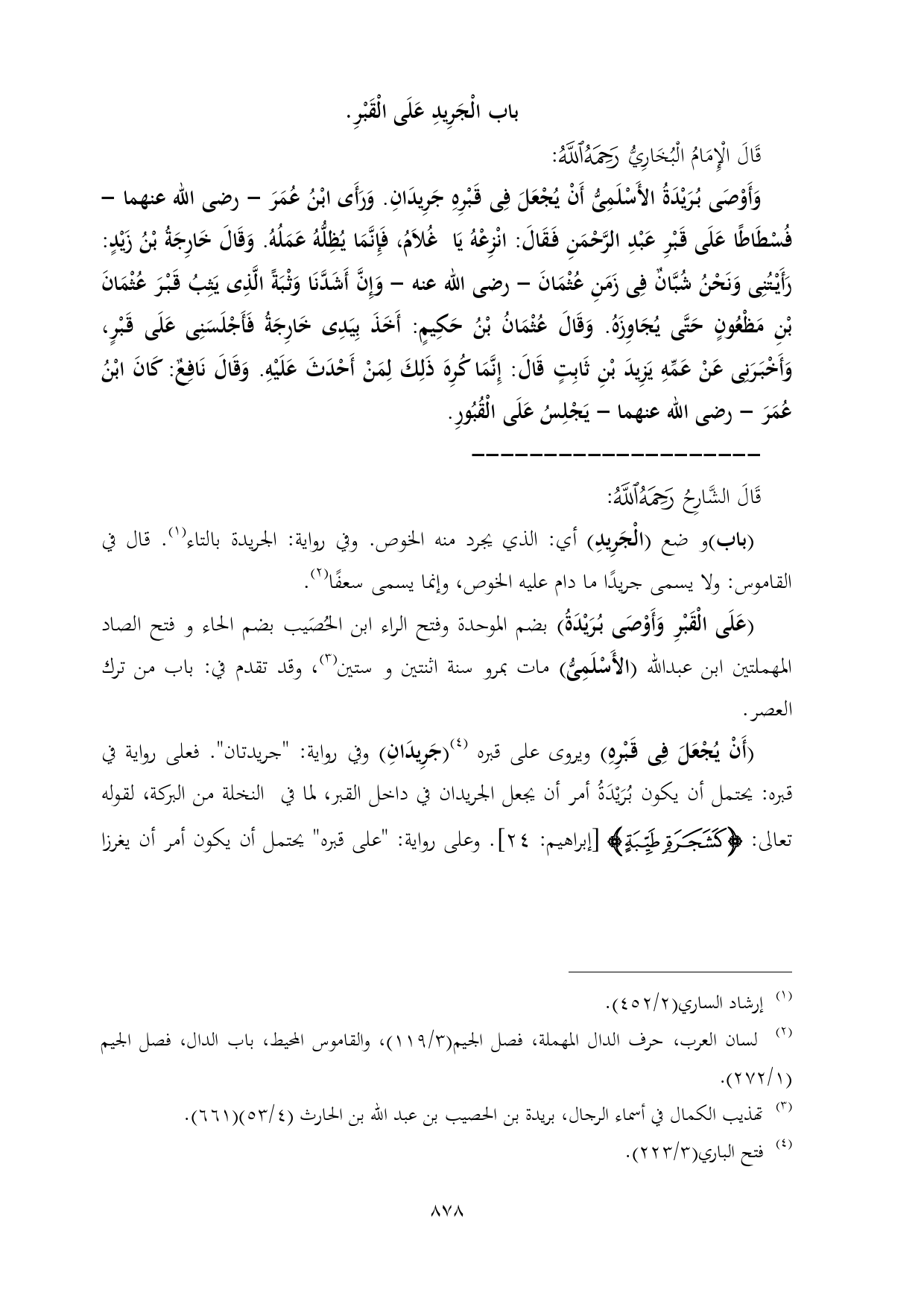 (أَنْ يُجْعَلَ فِى قَبْرِهِ) ويروى على قبره (¬٤) (جَرِيدَانِ) وفي رواية: "جريدتان". فعلى رواية في قبره: يحتمل أن يكون بُرَيْدَةُ أمر أن يجعل الجريدان في داخل القبر، لما في النخلة من البركة، لقوله تعالى: {كَشَجَرَةٍ طَيِّبَةٍ} [إبراهيم: ٢٤]. وعلى رواية: "على قبره" يحتمل أن يكون أمر أن يغرزا
