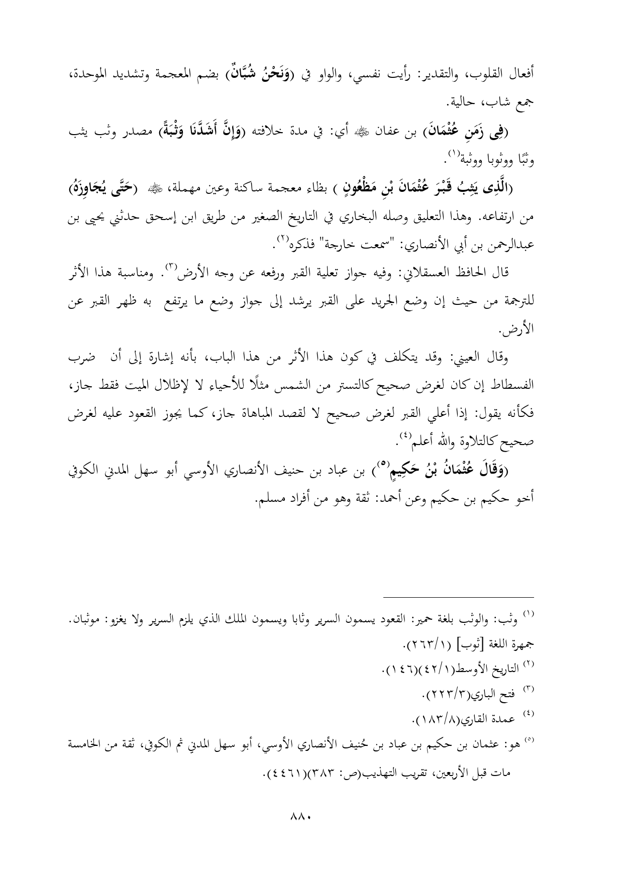 قال الحافظ العسقلاني: وفيه جواز تعلية القبر ورفعه عن وجه الأرض (¬٣). ومناسبة هذا الأثر للترجمة من حيث إن وضع الجريد على القبر يرشد إلى جواز وضع ما يرتفع به ظهر القبر عن الأرض.