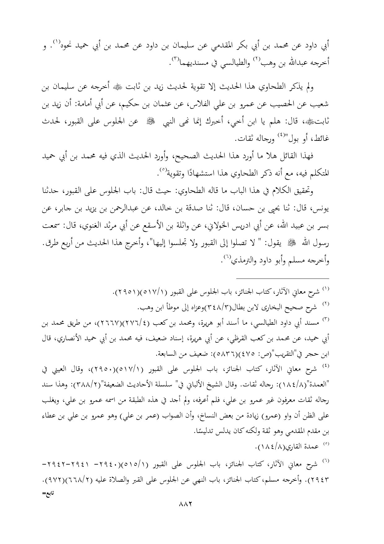 (¬١) شرح معاني الآثار، كتاب الجنائز، باب الجلوس على القبور (١/ ٥١٧) (٢٩٥١).