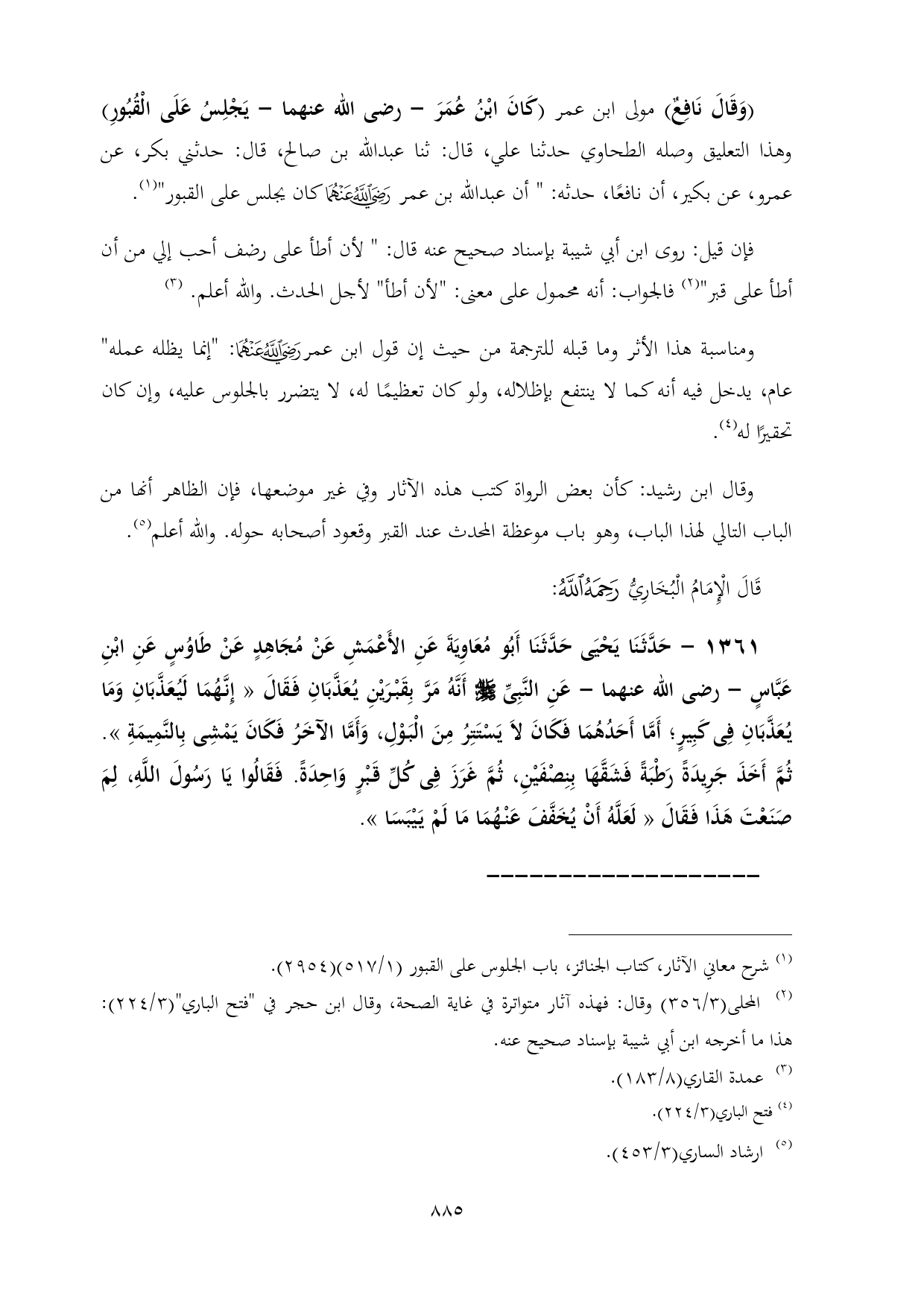 (وَقَالَ نَافِعٌ) مولى ابن عمر (كَانَ ابْنُ عُمَرَ - رضى الله عنهما - يَجْلِسُ عَلَى الْقُبُورِ) وهذا التعليق وصله الطحاوي حدثنا علي، قال: ثنا عبدالله بن صالح، قال: حدثني بكر، عن عمرو، عن بكير، أن نافعًا، حدثه: " أن عبدالله بن عمر - رضي الله عنهما - كان يجلس على القبور" (¬١).