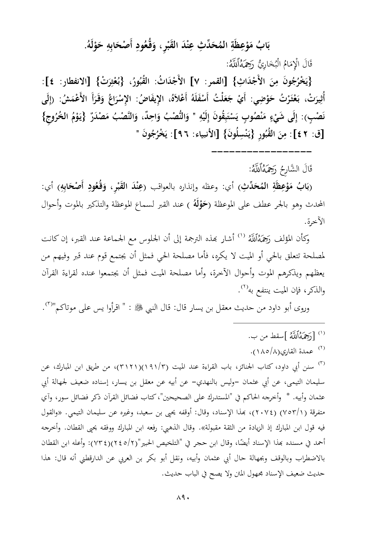 وكأن المؤلف - رحمه الله - (¬١) أشار بهذه الترجمة إلى أن الجلوس مع الجماعة عند القبر، إن كانت لمصلحة تتعلق بالحي أو الميت لا يكره، فأما مصلحة الحي فمثل أن يجتمع قوم عند قبر وفيهم من يعظهم ويذكرهم الموت وأحوال الآخرة، وأما مصلحة الميت فمثل أن يجتمعوا عنده لقراءة القرآن والذكر، فإن الميت ينتفع به (¬٢).