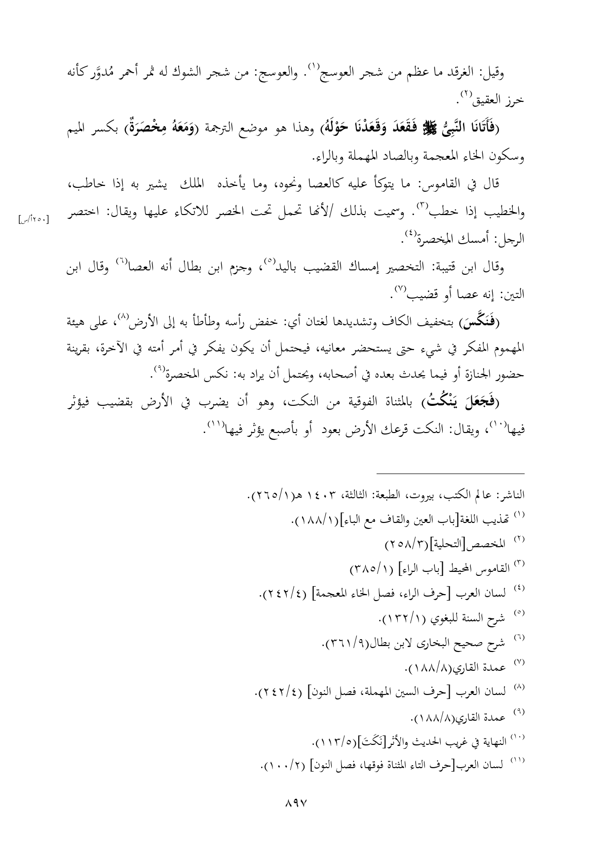 وقال ابن قتيبة: التخصير إمساك القضيب باليد (¬٥)، وجزم ابن بطال أنه العصا (¬٦) وقال ابن التين: إنه عصا أو قضيب (¬٧).