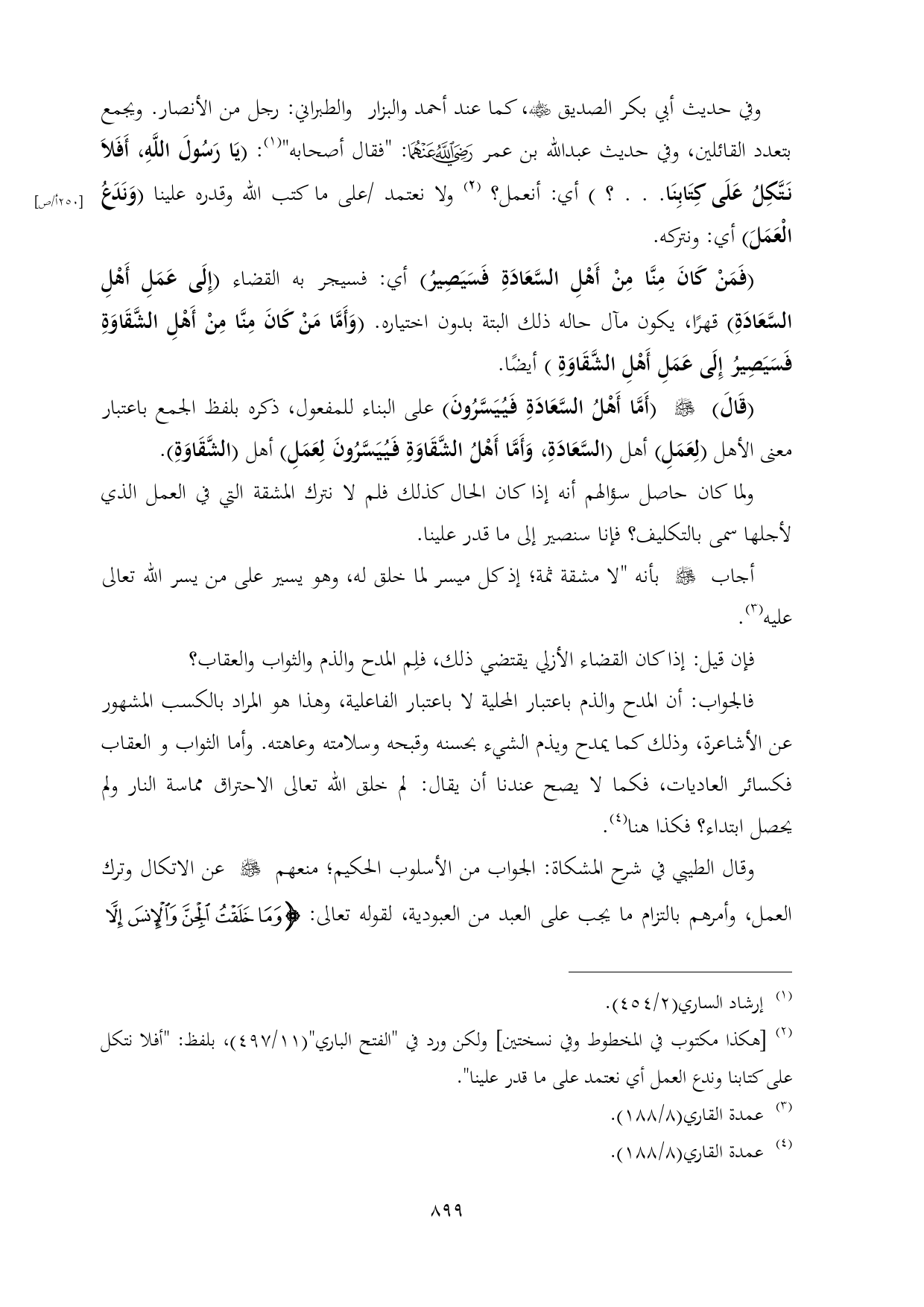 (¬٢) [هكذا مكتوب في المخطوط وفي نسختين] ولكن ورد في "الفتح الباري" (١١/ ٤٩٧)، بلفظ: "أفلا نتكل على كتابنا وندع العمل أي نعتمد على ما قدر علينا".