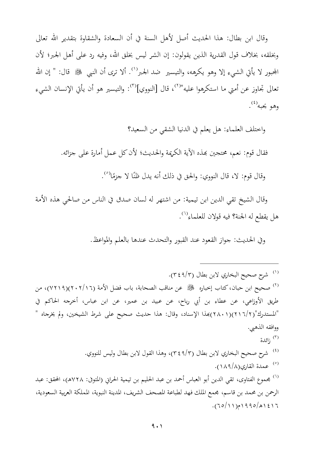 وقال ابن بطال: هذا الحديث أصل لأهل السنة في أن السعادة والشقاوة بتقدير الله تعالى وبخلقه، بخلاف قول القدرية الذين يقولون: إن الشر ليس بخلق الله، وفيه رد على أهل الجبر؛ لأن المجبور لا يأتي الشيء إلا وهو يكرهه، والتيسير ضد الجبر (¬١). ألا ترى أن النبي - صلى الله عليه وسلم - قال: " إن الله تعالى تجاوز عن أمتي ما استكرهوا عليه" (¬٢)، قال [النووي] (¬٣): والتيسير هو أن يأتي الإنسان الشيء وهو يحبه (¬٤).