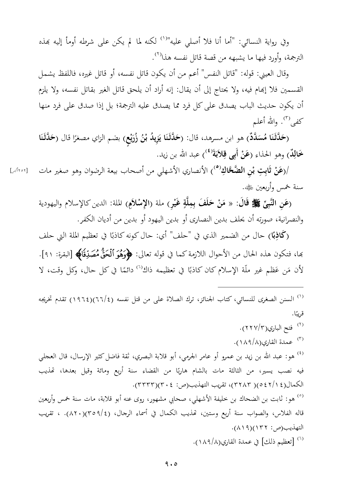 (حَدَّثَنَا مُسَدَّدٌ) هو ابن مسرهد، قال: (حَدَّثَنَا يَزِيدُ بْنُ زُرَيْعٍ) بضم الزاي مصغرًا قال (حَدَّثَنَا خَالِدٌ) وهو الحذاء (عَنْ أَبِى قِلَابَةَ (¬٤)) عبد الله بن زيد.