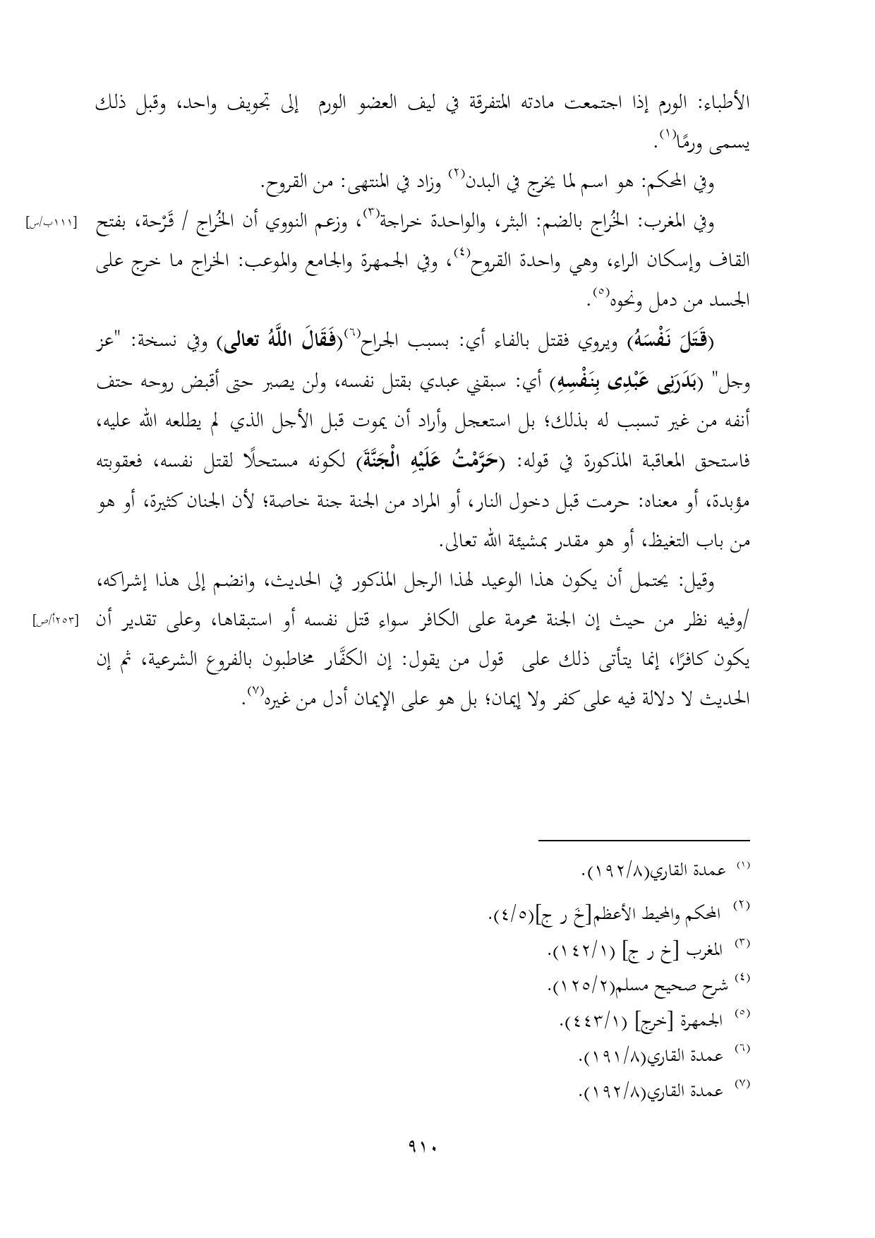 وفي المغرب: الخُراج بالضم: البثر، والواحدة خراجة (¬٣)، وزعم النووي أن الخُراج / قَرْحة، بفتح القاف وإسكان الراء، وهي واحدة القروح (¬٤)، وفي الجمهرة والجامع والموعب: الخراج ما خرج على الجسد من دمل ونحوه (¬٥).