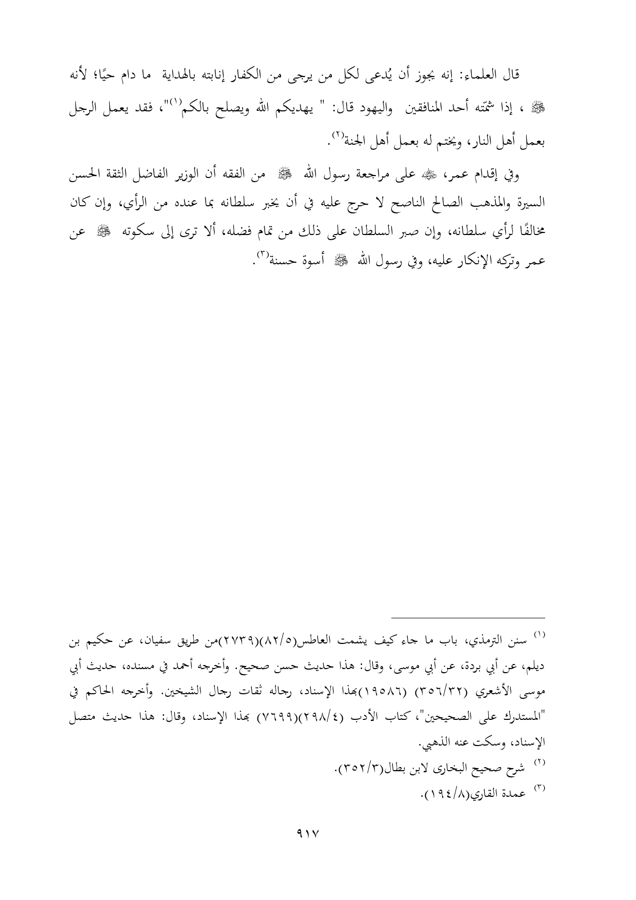 وفي إقدام عمر، - رضي الله عنه - على مراجعة رسول الله - صلى الله عليه وسلم - من الفقه أن الوزير الفاضل الثقة الحسن السيرة والمذهب الصالح الناصح لا حرج عليه في أن يخبر سلطانه بما عنده من الرأي، وإن كان مخالفًا لرأي سلطانه، وإن صبر السلطان على ذلك من تمام فضله، ألا ترى إلى سكوته - صلى الله عليه وسلم - عن عمر وتركه الإنكار عليه، وفي رسول الله - صلى الله عليه وسلم - أسوة حسنة (¬٣).