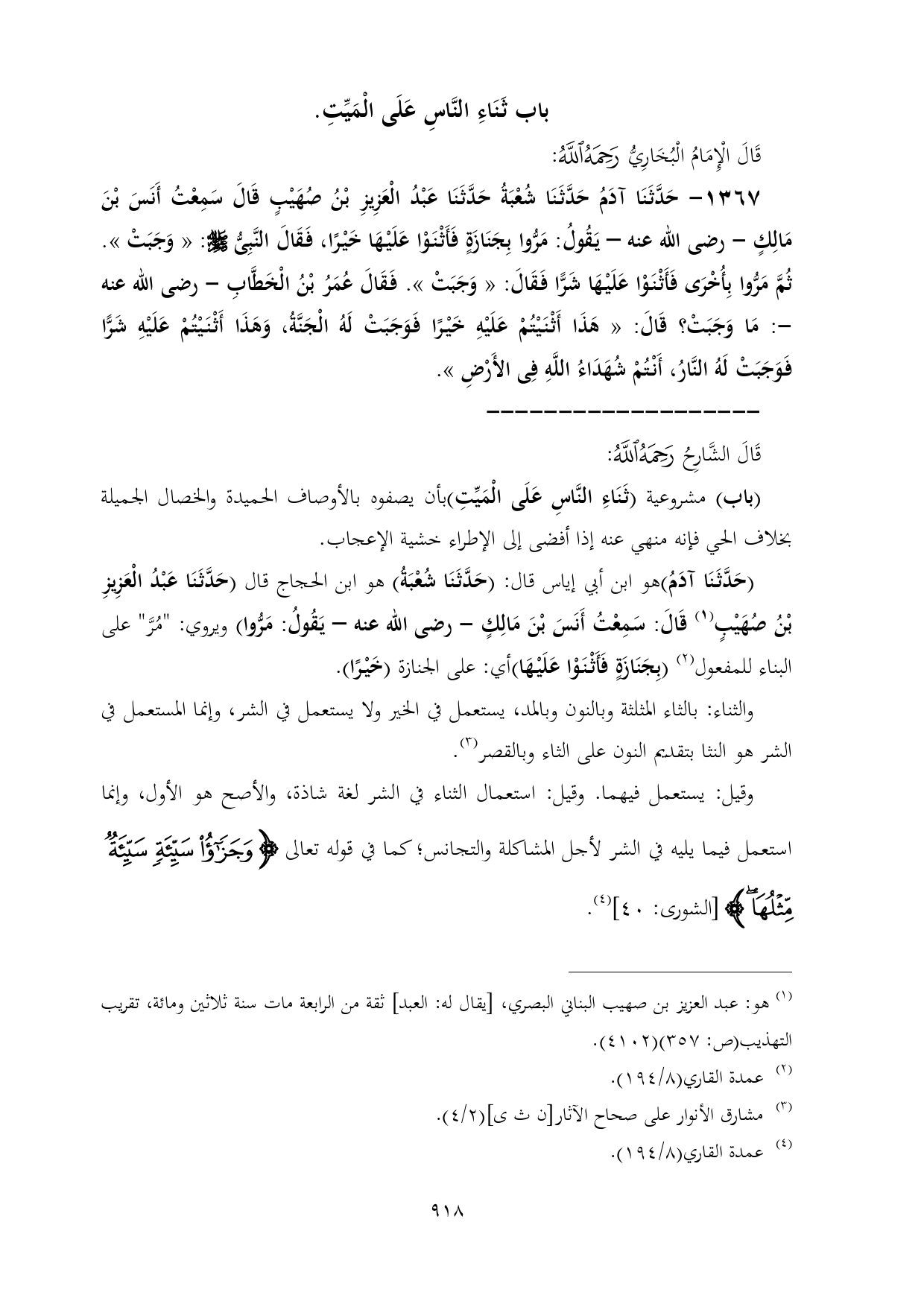 (حَدَّثَنَا آدَمُ) هو ابن أبي إياس قال: (حَدَّثَنَا شُعْبَةُ) هو ابن الحجاج قال (حَدَّثَنَا عَبْدُ الْعَزِيزِ بْنُ صُهَيْبٍ (¬١) قَالَ: سَمِعْتُ أَنَسَ بْنَ مَالِكٍ - رضى الله عنه - يَقُولُ: مَرُّوا) ويروي: "مُرَّ" على البناء للمفعول (¬٢) (بِجَنَازَةٍ فَأَثْنَوْا عَلَيْهَا) أي: على الجنازة (خَيْرًا).