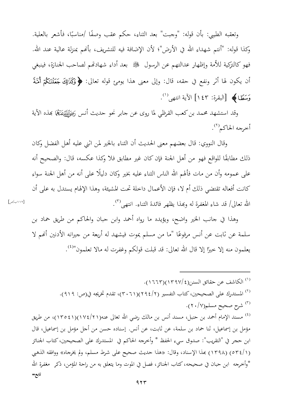 وتعقبه الطيبي: بأن قوله: "وجبت" بعد الثناء، حكم عقب وصفًا /مناسبًا، فأشعر بالعلية. وكذا قوله: "أنتم شهداء الله في الأرض"؛ لأن الإضافة فيه للتشريف، بأنهم بمنزلة عالية عند الله. فهو كالتزكية للأمة وإظهار عدالتهم عن الرسول - صلى الله عليه وسلم - بعد أداء شهادتهم لصاحب الجنازة، فينبغي أن يكون لها أثر ونفع في حقه، قال: وإلى معنى هذا يومئ قوله تعالى: {وَكَذَلِكَ جَعَلْنَاكُمْ أُمَّةً وَسَطًا} [البقرة: ١٤٣] الآية انتهى (¬١).