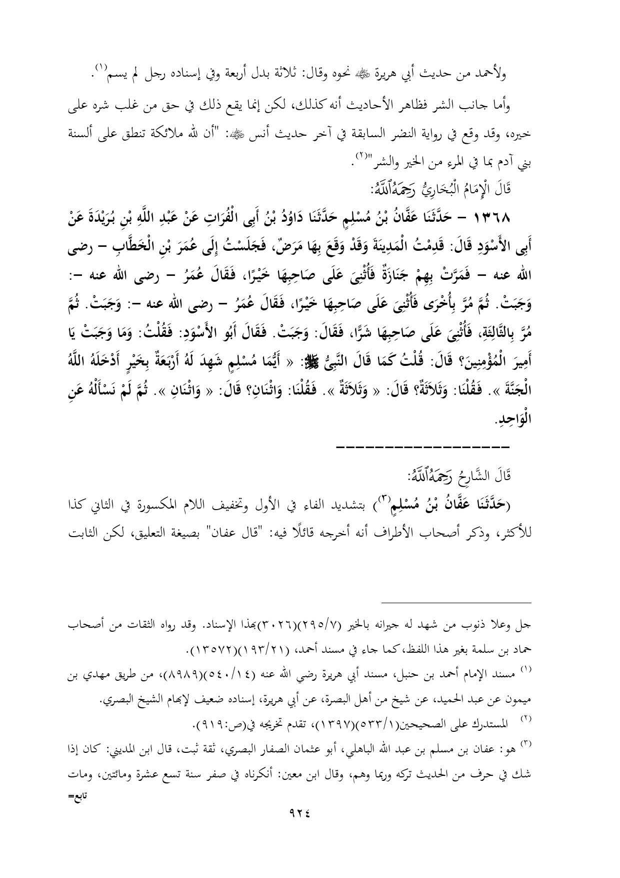 ١٣٦٨ - حَدَّثَنَا عَفَّانُ بْنُ مُسْلِمٍ حَدَّثَنَا دَاوُدُ بْنُ أَبِى الْفُرَاتِ عَنْ عَبْدِ اللَّهِ بْنِ بُرَيْدَةَ عَنْ أَبِى الأَسْوَدِ قَالَ: قَدِمْتُ الْمَدِينَةَ وَقَدْ وَقَعَ بِهَا مَرَضٌ، فَجَلَسْتُ إِلَى عُمَرَ بْنِ الْخَطَّابِ - رضى الله عنه - فَمَرَّتْ بِهِمْ جَنَازَةٌ فَأُثْنِىَ عَلَى صَاحِبِهَا خَيْرًا, فَقَالَ عُمَرُ - رضى الله عنه -: وَجَبَتْ. ثُمَّ مُرَّ بِأُخْرَى فَأُثْنِىَ عَلَى صَاحِبِهَا خَيْرًا، فَقَالَ عُمَرُ - رضى الله عنه -: وَجَبَتْ. ثُمَّ مُرَّ بِالثَّالِثَةِ، فَأُثْنِىَ عَلَى صَاحِبِهَا شَرًّا, فَقَالَ: وَجَبَتْ. فَقَالَ أَبُو الأَسْوَدِ: فَقُلْتُ: وَمَا وَجَبَتْ يَا أَمِيرَ الْمُؤْمِنِينَ؟ قَالَ: قُلْتُ كَمَا قَالَ النَّبِىُّ - صلى الله عليه وسلم -: «أَيُّمَا مُسْلِمٍ شَهِدَ لَهُ أَرْبَعَةٌ بِخَيْرٍ أَدْخَلَهُ اللَّهُ الْجَنَّةَ». فَقُلْنَا: وَثَلَاثَةٌ؟ قَالَ: «وَثَلَاثَةٌ». فَقُلْنَا: وَاثْنَانِ؟ قَالَ: «وَاثْنَانِ». ثُمَّ لَمْ نَسْأَلْهُ عَنِ الْوَاحِدِ.