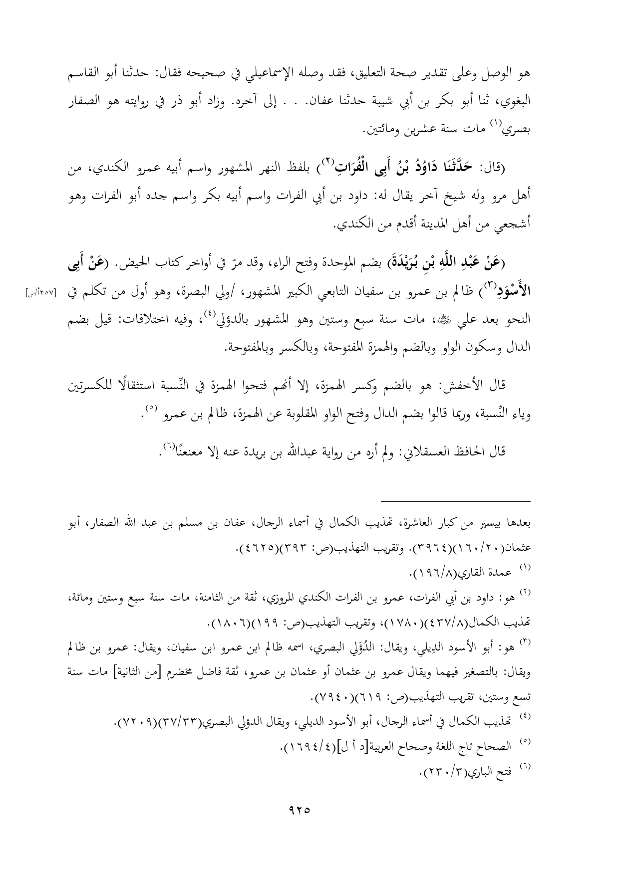 (عَنْ عَبْدِ اللَّهِ بْنِ بُرَيْدَةَ) بضم الموحدة وفتح الراء، وقد مرّ في أواخر كتاب الحيض. (عَنْ أَبِى الأَسْوَدِ (¬٣)) ظالم بن عمرو بن سفيان التابعي الكبير المشهور, /ولي البصرة, وهو أول من تكلم في النحو بعد علي - رضي الله عنه - , مات سنة سبع وستين وهو المشهور بالدؤلي (¬٤)، وفيه اختلافات: قيل بضم الدال وسكون الواو وبالضم والهمزة المفتوحة، وبالكسر وبالمفتوحة.