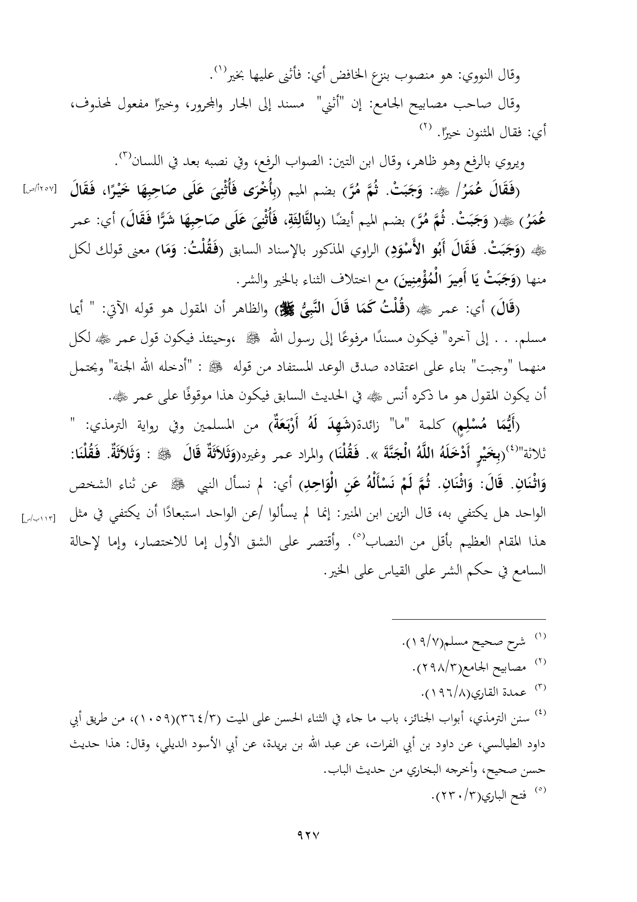 وقال صاحب مصابيح الجامع: إن "أثني" مسند إلى الجار والمجرور، وخيرًا مفعول لمحذوف، أي: فقال المثنون خيرًا. (¬٢)