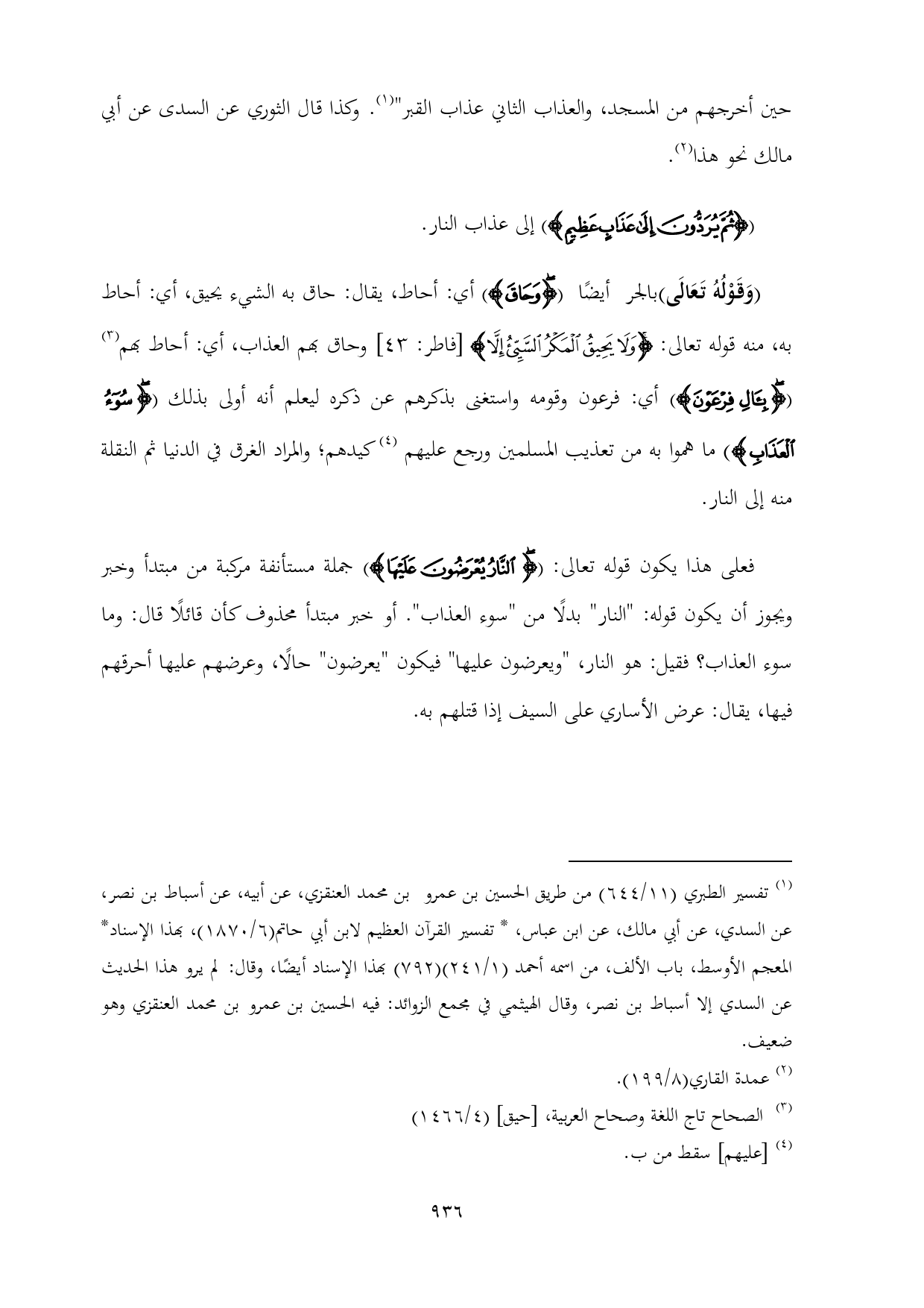 (وَقَوْلُهُ تَعَالَى) بالجر أيضًا ({وَحَاقَ}) أي: أحاط، يقال: حاق به الشيء يحيق، أي: أحاط به, منه قوله تعالى: {وَلَا يَحِيقُ الْمَكْرُ السَّيِّئُ إِلَّا} [فاطر: ٤٣] وحاق بهم العذاب، أي: أحاط بهم (¬٣) ({بِآلِ فِرْعَوْنَ}) أي: فرعون وقومه واستغنى بذكرهم عن ذكره ليعلم أنه أولى بذلك ({سُوءُ الْعَذَابِ}) ما هموا به من تعذيب المسلمين ورجع عليهم (¬٤) كيدهم؛ والمراد الغرق في الدنيا ثم النقلة منه إلى النار.
