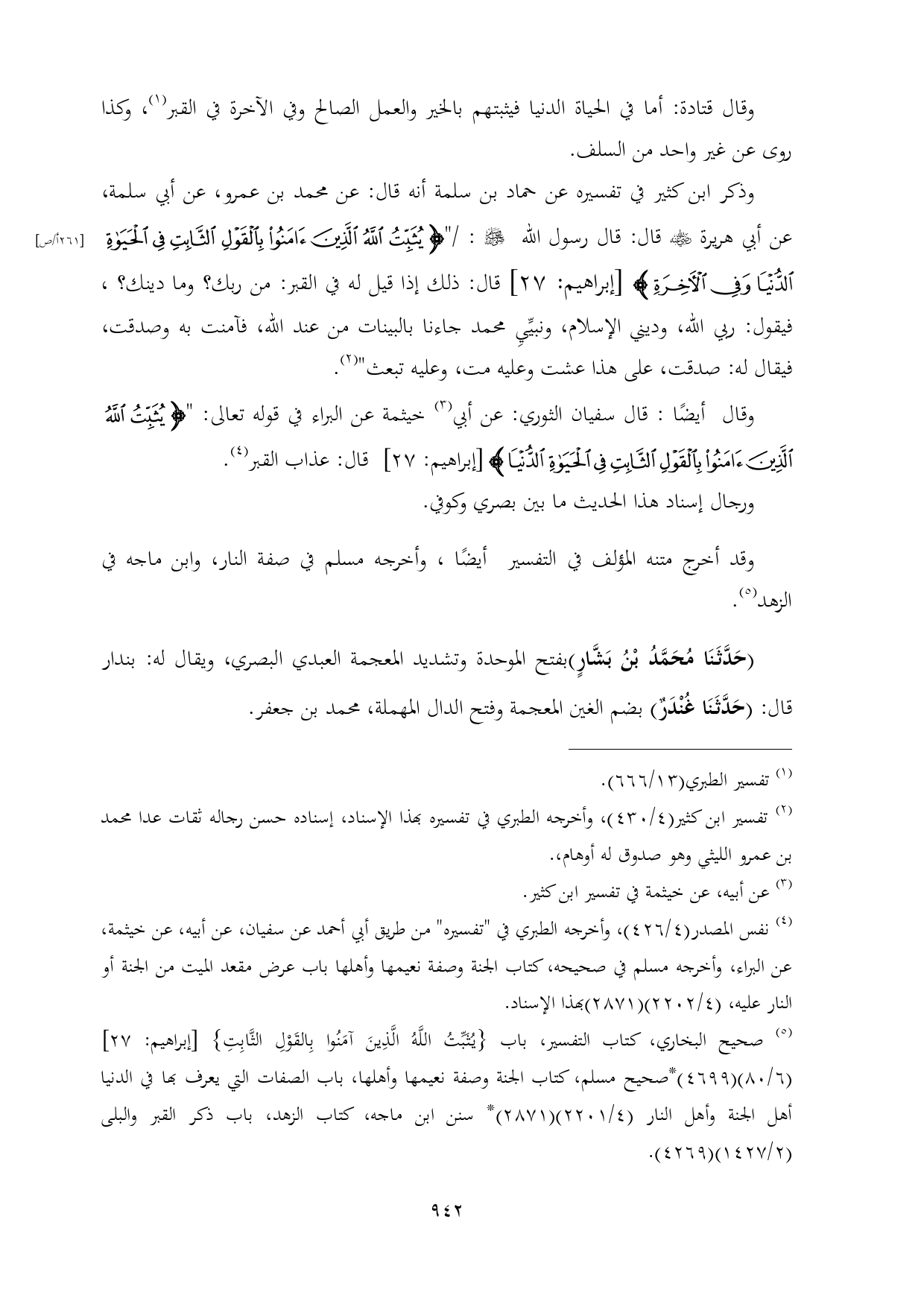 (¬٥) صحيح البخاري، كتاب التفسير، باب {يُثَبِّتُ اللَّهُ الَّذِينَ آمَنُوا بِالقَوْلِ الثَّابِتِ} [إبراهيم: ٢٧] (٦/ ٨٠) (٤٦٩٩) *صحيح مسلم، كتاب الجنة وصفة نعيمها وأهلها، باب الصفات التي يعرف بها في الدنيا أهل الجنة وأهل النار (٤/ ٢٢٠١) (٢٨٧١) * سنن ابن ماجه، كتاب الزهد، باب ذكر القبر والبلى (٢/ ١٤٢٧) (٤٢٦٩).