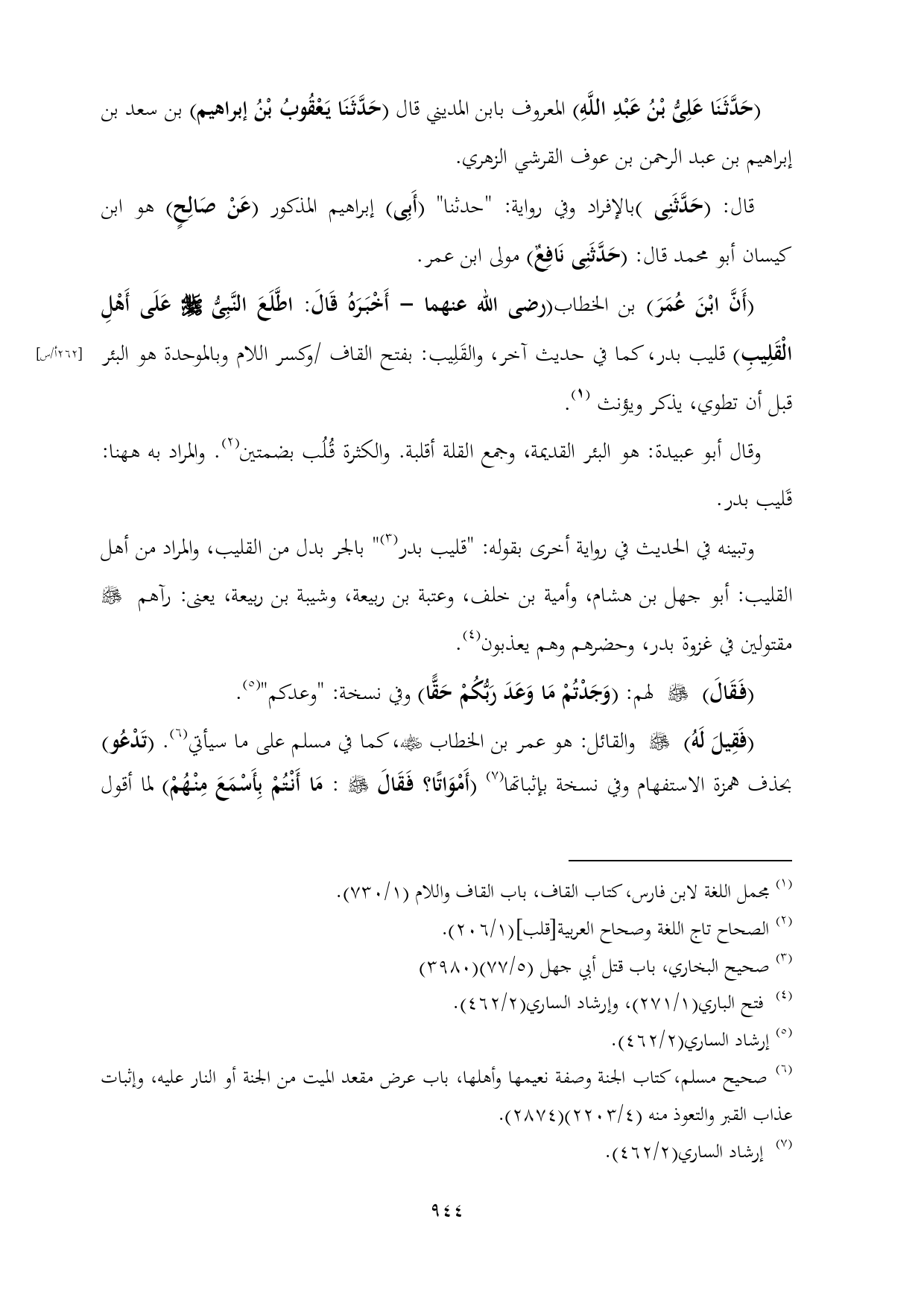 (أَنَّ ابْنَ عُمَرَ) بن الخطاب (رضى الله عنهما - أَخْبَرَهُ قَالَ: اطَّلَعَ النَّبِىُّ - صلى الله عليه وسلم - عَلَى أَهْلِ الْقَلِيبِ) قليب بدر، كما في حديث آخر، والقَلِيب: بفتح القاف /وكسر اللام وبالموحدة هو البئر قبل أن تطوي، يذكر ويؤنث (¬١).
