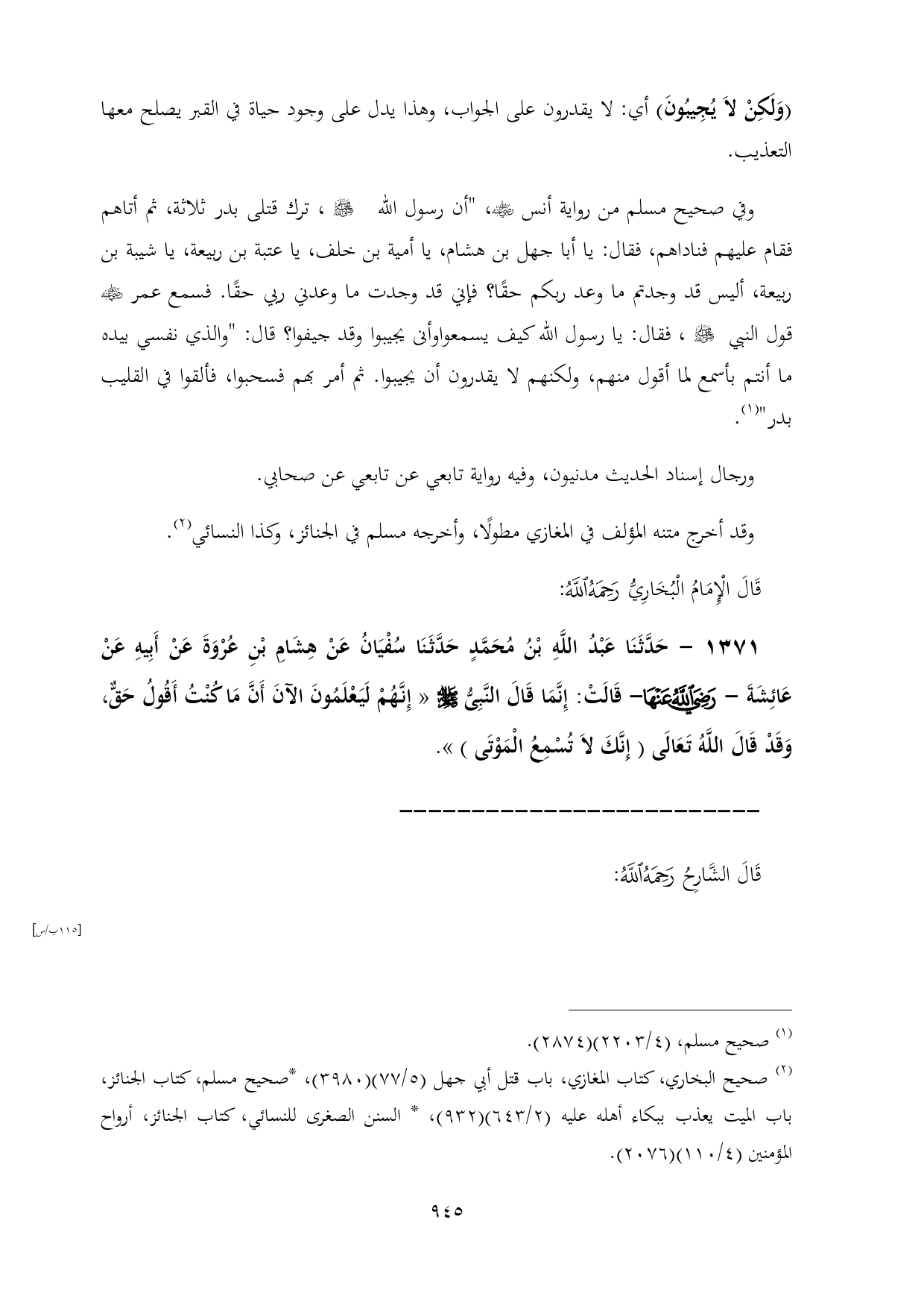 (¬٢) صحيح البخاري، كتاب المغازي، باب قتل أبي جهل (٥/ ٧٧) (٣٩٨٠)، *صحيح مسلم، كتاب الجنائز، باب الميت يعذب ببكاء أهله عليه (٢/ ٦٤٣) (٩٣٢)، * السنن الصغرى للنسائي، كتاب الجنائز، أرواح المؤمنين (٤/ ١١٠) (٢٠٧٦).