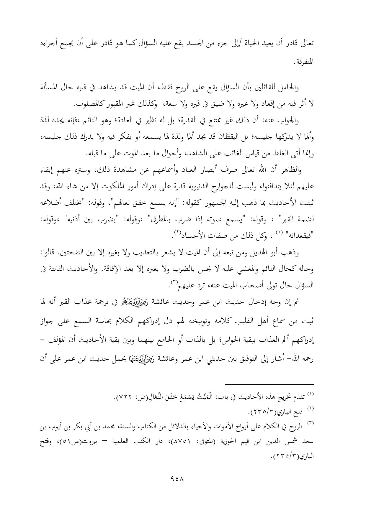 والظاهر أن الله تعالى صرف أبصار العباد وأسماعهم عن مشاهدة ذلك, وستره عنهم إبقاء عليهم لئلا يتدافنوا, وليست للجوارح الدنيوية قدرة على إدراك أمور الملكوت إلا من شاء الله, وقد ثبتت الأحاديث بما ذهب إليه الجمهور كقوله: "إنه يسمع خفق نعالهم", وقوله: "يختلف أضلاعه لضمة القبر" , وقوله: "يسمع صوته إذا ضرب بالمطرق" ,وقوله: "يضرب بين أذنيه" ,وقوله: "فيقعدانه" (¬١) , وكل ذلك من صفات الأجساد (¬٢).