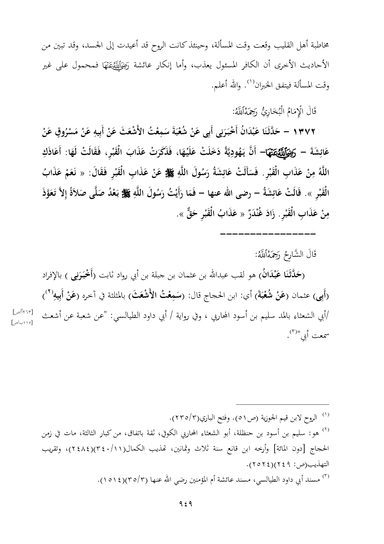١٣٧٢ - حَدَّثَنَا عَبْدَانُ أَخْبَرَنِى أَبِى عَنْ شُعْبَةَ سَمِعْتُ الأَشْعَثَ عَنْ أَبِيهِ عَنْ مَسْرُوقٍ عَنْ عَائِشَةَ - رضي الله عنها - أَنَّ يَهُودِيَّةً دَخَلَتْ عَلَيْهَا، فَذَكَرَتْ عَذَابَ الْقَبْرِ، فَقَالَتْ لَهَا: أَعَاذَكِ اللَّهُ مِنْ عَذَابِ الْقَبْرِ. فَسَأَلَتْ عَائِشَةُ رَسُولَ اللَّهِ - صلى الله عليه وسلم - عَنْ عَذَابِ الْقَبْرِ فَقَالَ: «نَعَمْ عَذَابُ الْقَبْرِ». قَالَتْ عَائِشَةُ - رضى الله عنها - فَمَا رَأَيْتُ رَسُولَ اللَّهِ - صلى الله عليه وسلم - بَعْدُ صَلَّى صَلَاةً إِلَاّ تَعَوَّذَ مِنْ عَذَابِ الْقَبْرِ. زَادَ غُنْدَرٌ «عَذَابُ الْقَبْرِ حَقٌّ».