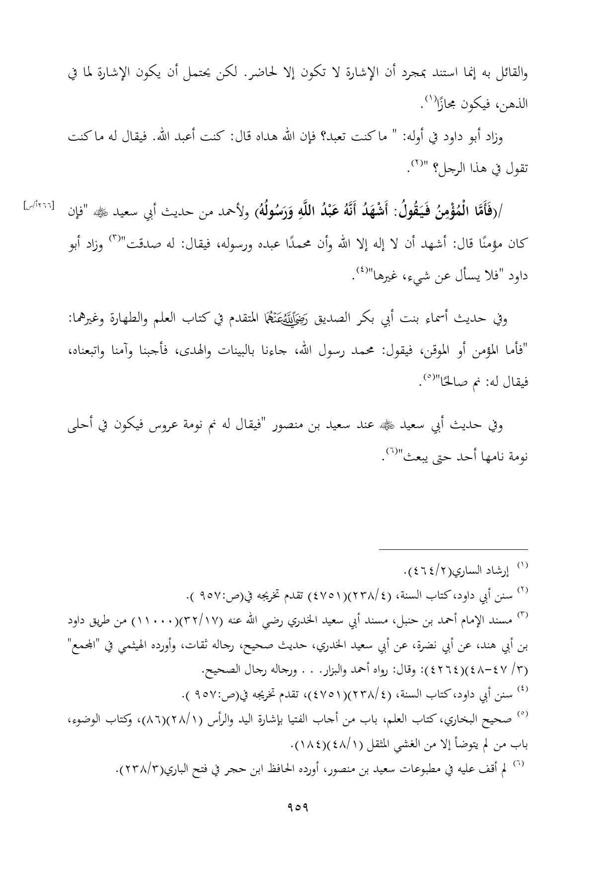 / (فَأَمَّا الْمُؤْمِنُ فَيَقُولُ: أَشْهَدُ أَنَّهُ عَبْدُ اللَّهِ وَرَسُولُهُ) ولأحمد من حديث أبي سعيد - رضي الله عنه - "فإن كان مؤمنًا قال: أشهد أن لا إله إلا الله وأن محمدًا عبده ورسوله، فيقال: له صدقت" (¬٣) وزاد أبو داود "فلا يسأل عن شيء، غيرها" (¬٤).
