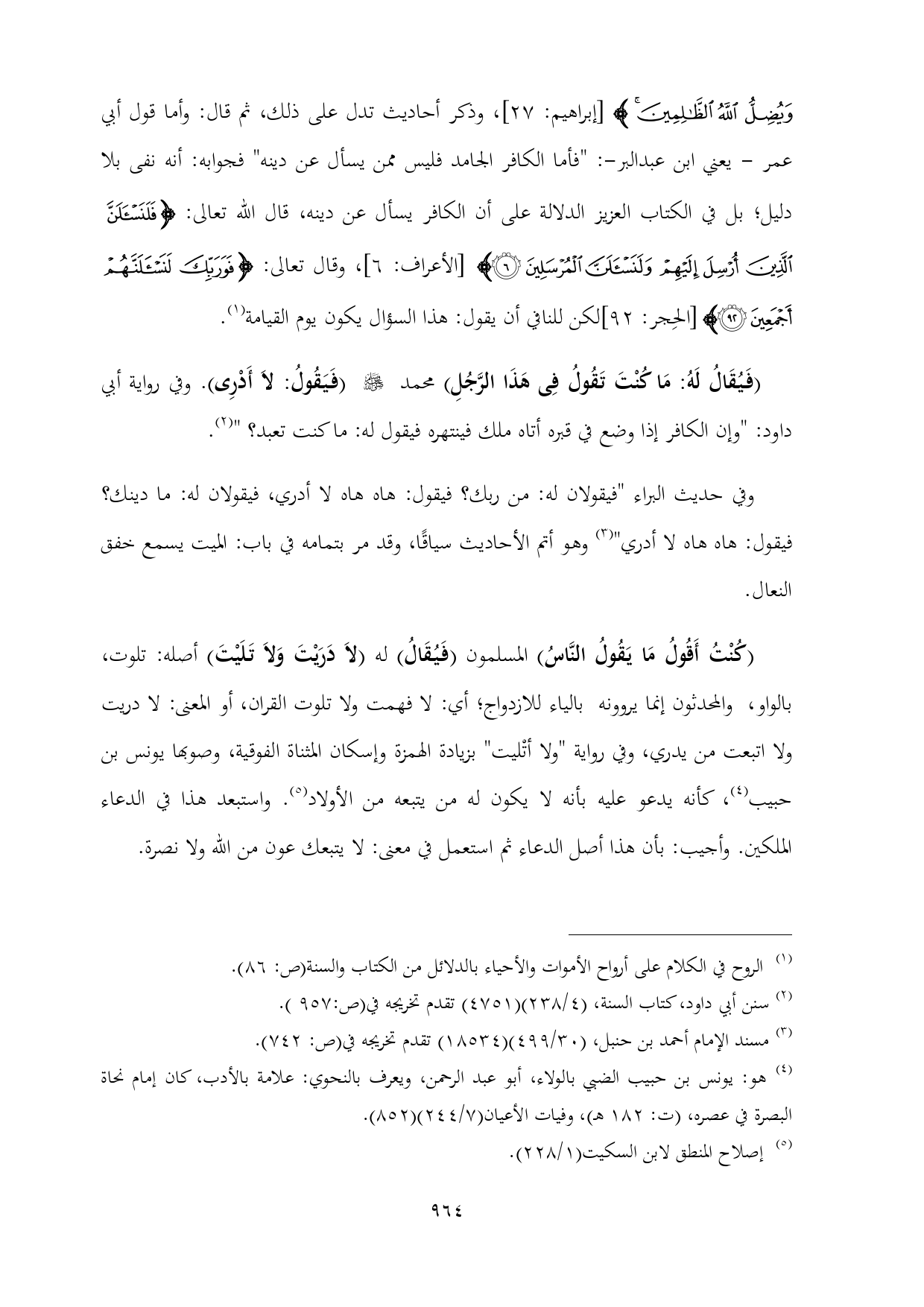 وَيُضِلُّ اللَّهُ الظَّالِمِينَ} [إبراهيم: ٢٧]، وذكر أحاديث تدل على ذلك، ثم قال: وأما قول أبي عمر - يعني ابن عبدالبر-: "فأما الكافر الجامد فليس ممن يسأل عن دينه" فجوابه: أنه نفى بلا دليل؛ بل في الكتاب العزيز الدلالة على أن الكافر يسأل عن دينه, قال الله تعالى: {فَلَنَسْأَلَنَّ الَّذِينَ أُرْسِلَ إِلَيْهِمْ وَلَنَسْأَلَنَّ الْمُرْسَلِينَ (٦)} [الأعراف: ٦]، وقال تعالى: {فَوَرَبِّكَ لَنَسْأَلَنَّهُمْ أَجْمَعِينَ (٩٢)} [الحِجر: ٩٢] لكن للنافي أن يقول: هذا السؤال يكون يوم القيامة (¬١).