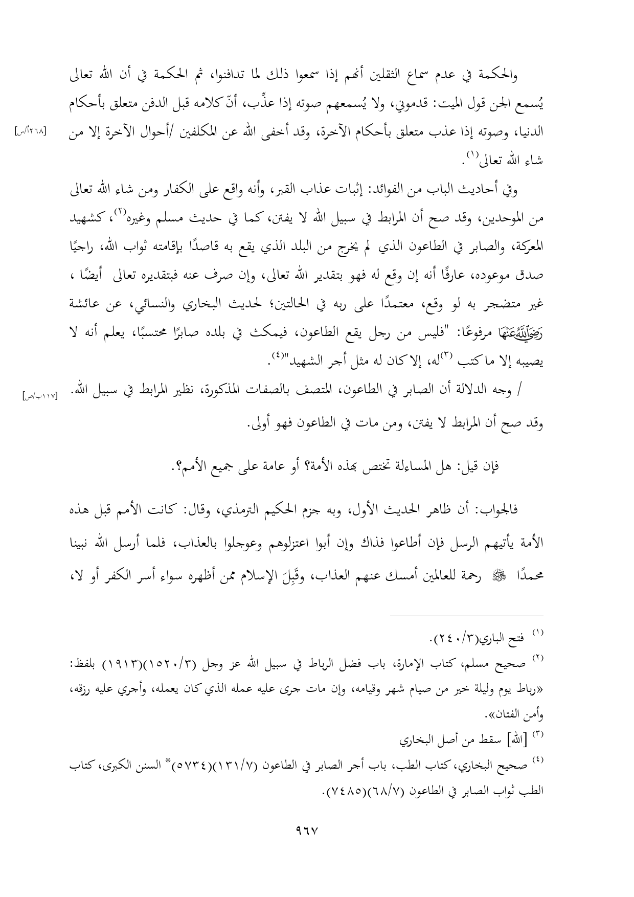 (¬٤) صحيح البخاري، كتاب الطب، باب أجر الصابر في الطاعون (٧/ ١٣١) (٥٧٣٤) * السنن الكبرى، كتاب الطب ثواب الصابر في الطاعون (٧/ ٦٨) (٧٤٨٥).