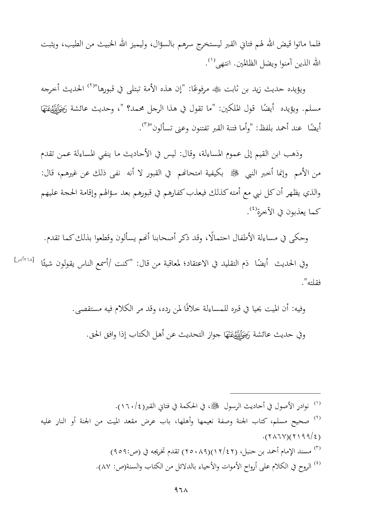 ويؤيده حديث زيد بن ثابت - رضي الله عنه - مرفوعًا: "إن هذه الأمة تبتلى في قبورها" (¬٢) الحديث أخرجه مسلم. ويؤيده أيضًا قول الملكين: "ما تقول في هذا الرجل محمد؟ "، وحديث عائشة - رضي الله عنها - أيضًا عند أحمد بلفظ: "وأما فتنة القبر تفتنون وعنى تسألون" (¬٣).