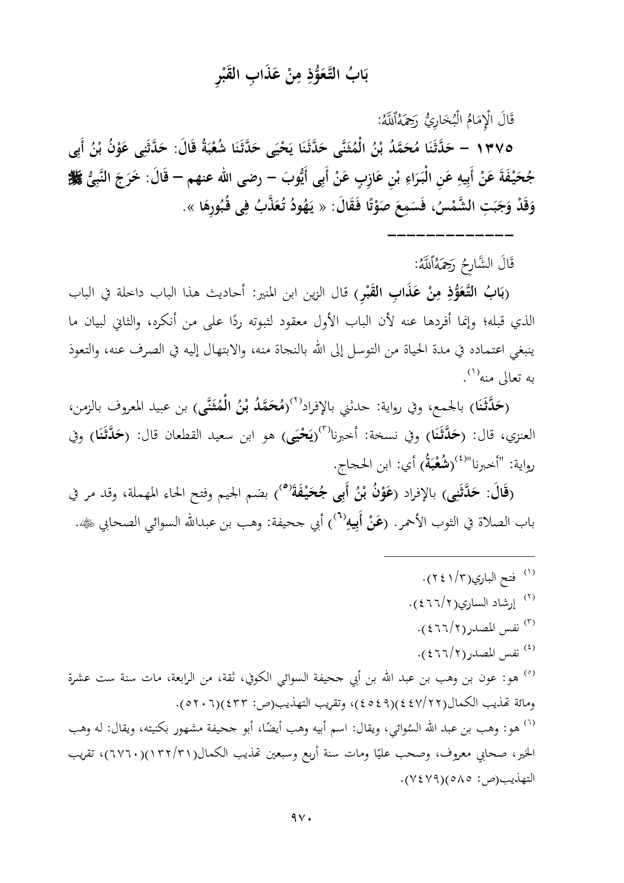 (¬٦) هو: وهب بن عبد الله السُوائي، ويقال: اسم أبيه وهب أيضًا، أبو جحيفة مشهور بكنيته، ويقال: له وهب الخير، صحابي معروف، وصحب عليًا ومات سنة أربع وسبعين تهذيب الكمال (٣١/ ١٣٢) (٦٧٦٠)، تقريب التهذيب (ص: ٥٨٥) (٧٤٧٩).