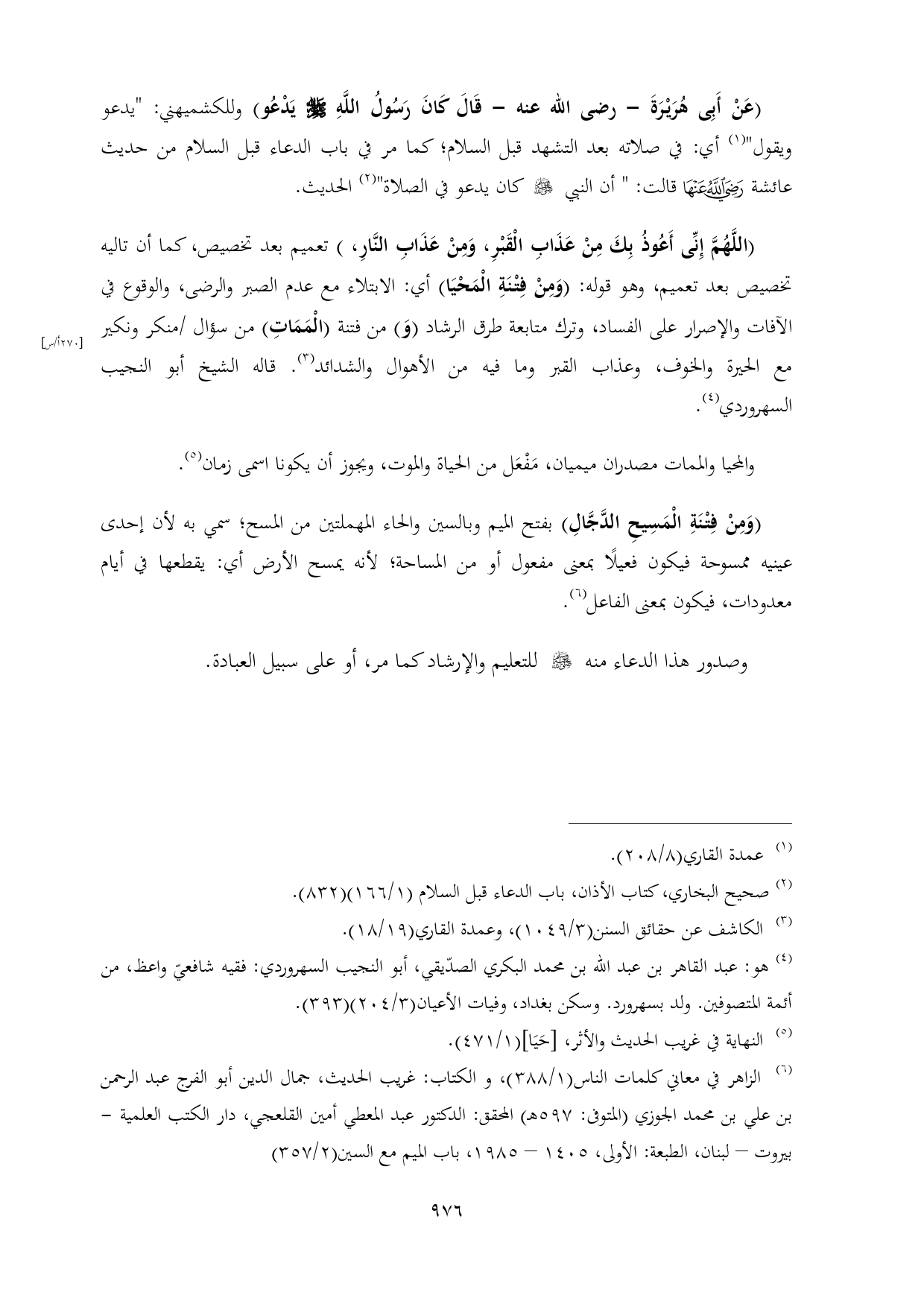(اللَّهُمَّ إِنِّى أَعُوذُ بِكَ مِنْ عَذَابِ الْقَبْرِ، وَمِنْ عَذَابِ النَّارِ،) تعميم بعد تخصيص، كما أن تاليه تخصيص بعد تعميم، وهو قوله: (وَمِنْ فِتْنَةِ الْمَحْيَا) أي: الابتلاء مع عدم الصبر والرضى، والوقوع في الآفات والإصرار على الفساد، وترك متابعة طرق الرشاد (وَ) من فتنة (الْمَمَاتِ) من سؤال /منكر ونكير مع الحيرة والخوف، وعذاب القبر وما فيه من الأهوال والشدائد (¬٣). قاله الشيخ أبو النجيب السهروردي (¬٤).