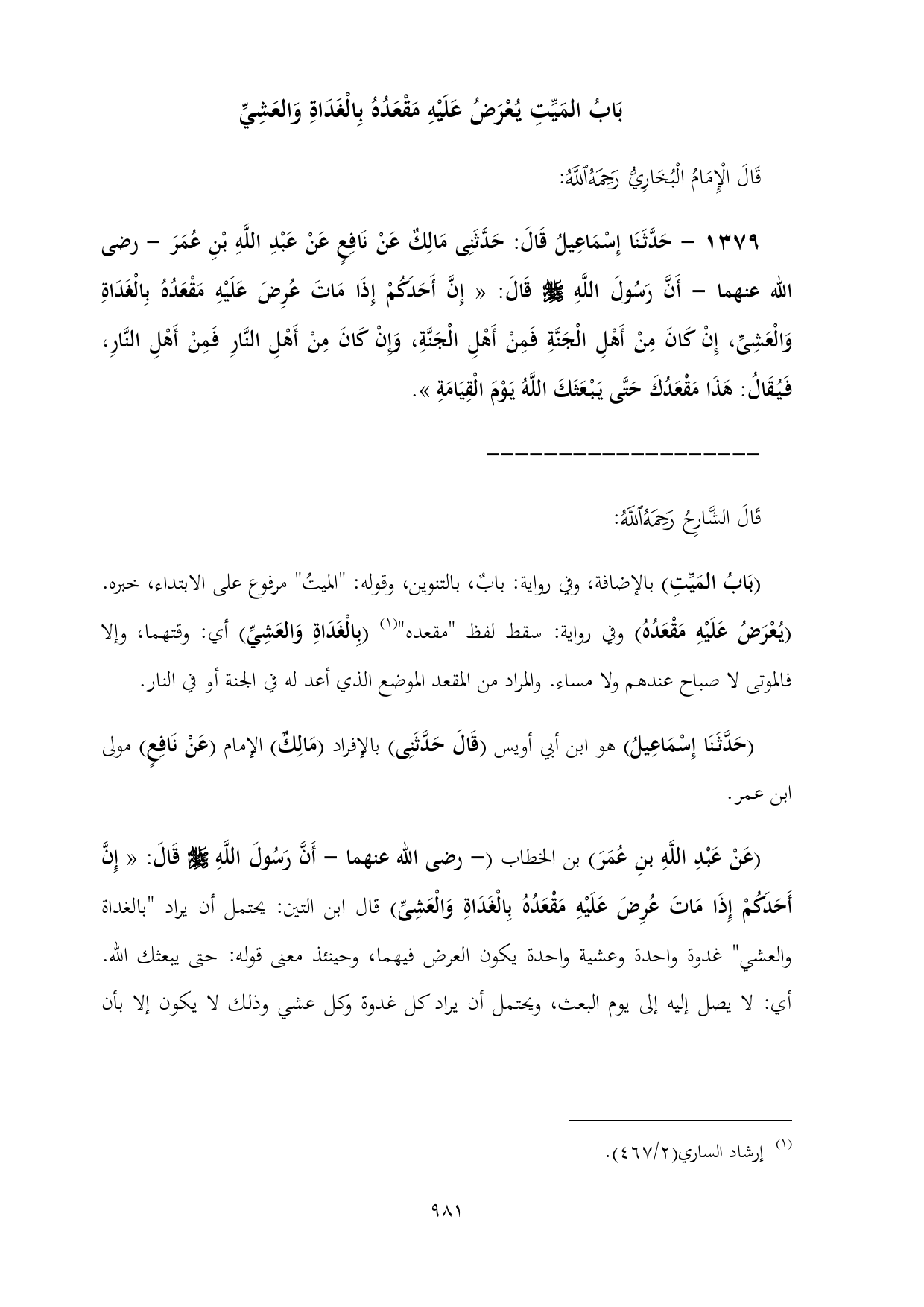 (عَنْ عَبْدِ اللَّهِ بنِ عُمَرَ) بن الخطاب (- رضى الله عنهما - أَنَّ رَسُولَ اللَّهِ - صلى الله عليه وسلم - قَالَ: «إِنَّ أَحَدَكُمْ إِذَا مَاتَ عُرِضَ عَلَيْهِ مَقْعَدُهُ بِالْغَدَاةِ وَالْعَشِىِّ) قال ابن التين: يحتمل أن يراد "بالغداة والعشي" غدوة واحدة وعشية واحدة يكون العرض فيهما، وحينئذ معنى قوله: حتى يبعثك الله. أي: لا يصل إليه إلى يوم البعث, ويحتمل أن يراد كل غدوة وكل عشي وذلك لا يكون إلا بأن