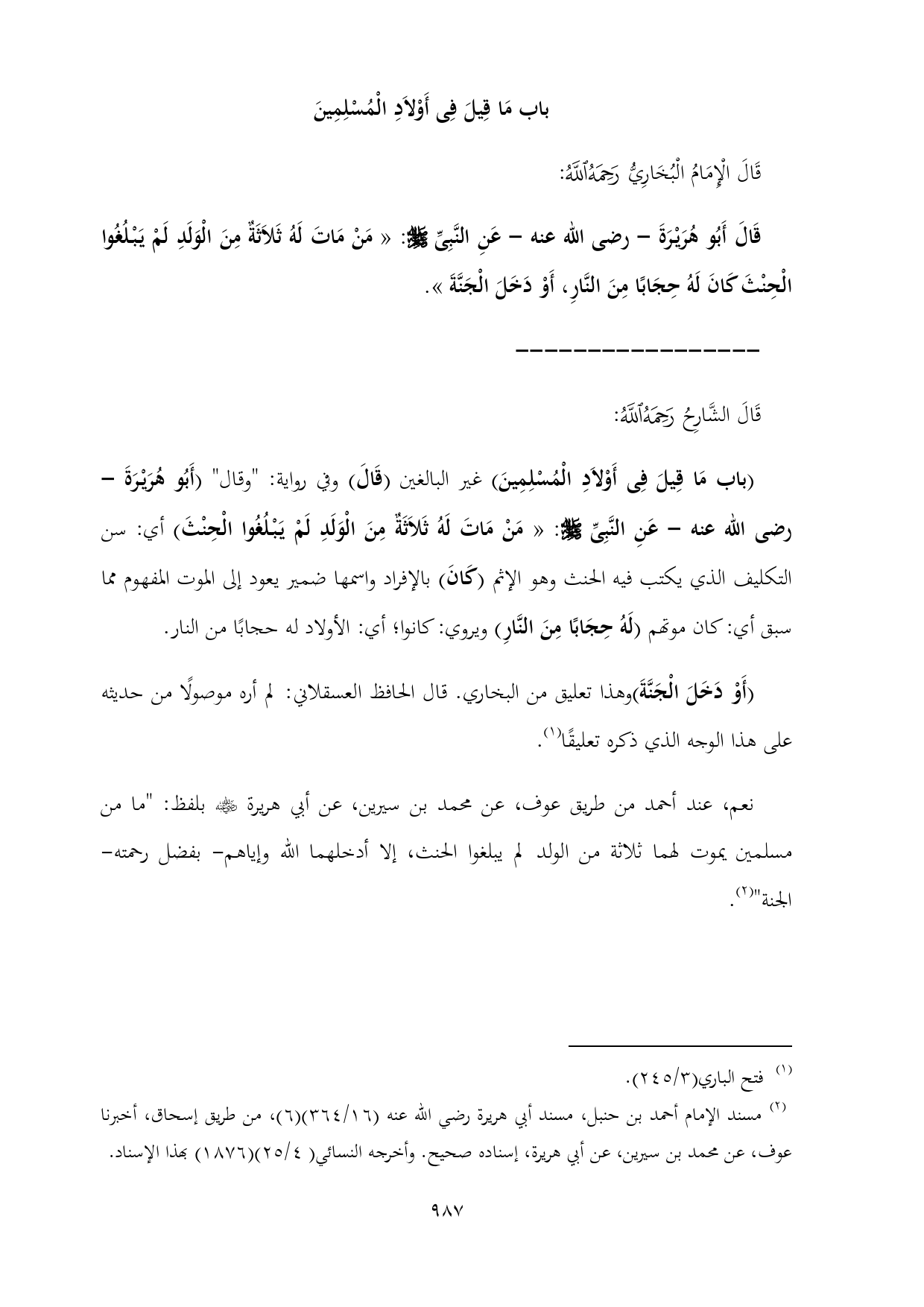 قَالَ أَبُو هُرَيْرَةَ - رضى الله عنه - عَنِ النَّبِىِّ - صلى الله عليه وسلم -: «مَنْ مَاتَ لَهُ ثَلَاثَةٌ مِنَ الْوَلَدِ لَمْ يَبْلُغُوا الْحِنْثَ كَانَ لَهُ حِجَابًا مِنَ النَّارِ، أَوْ دَخَلَ الْجَنَّةَ».