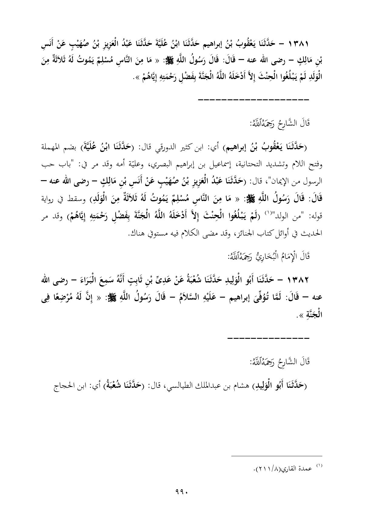 ١٣٨١ - حَدَّثَنَا يَعْقُوبُ بْنُ إبراهيم حَدَّثَنَا ابْنُ عُلَيَّةَ حَدَّثَنَا عَبْدُ الْعَزِيزِ بْنُ صُهَيْبٍ عَنْ أَنَسِ بْنِ مَالِكٍ - رضى الله عنه - قَالَ: قَالَ رَسُولُ اللَّهِ - صلى الله عليه وسلم -: «مَا مِنَ النَّاسِ مُسْلِمٌ يَمُوتُ لَهُ ثَلَاثَةٌ مِنَ الْوَلَدِ لَمْ يَبْلُغُوا الْحِنْثَ إِلَاّ أَدْخَلَهُ اللَّهُ الْجَنَّةَ بِفَضْلِ رَحْمَتِهِ إِيَّاهُمْ».