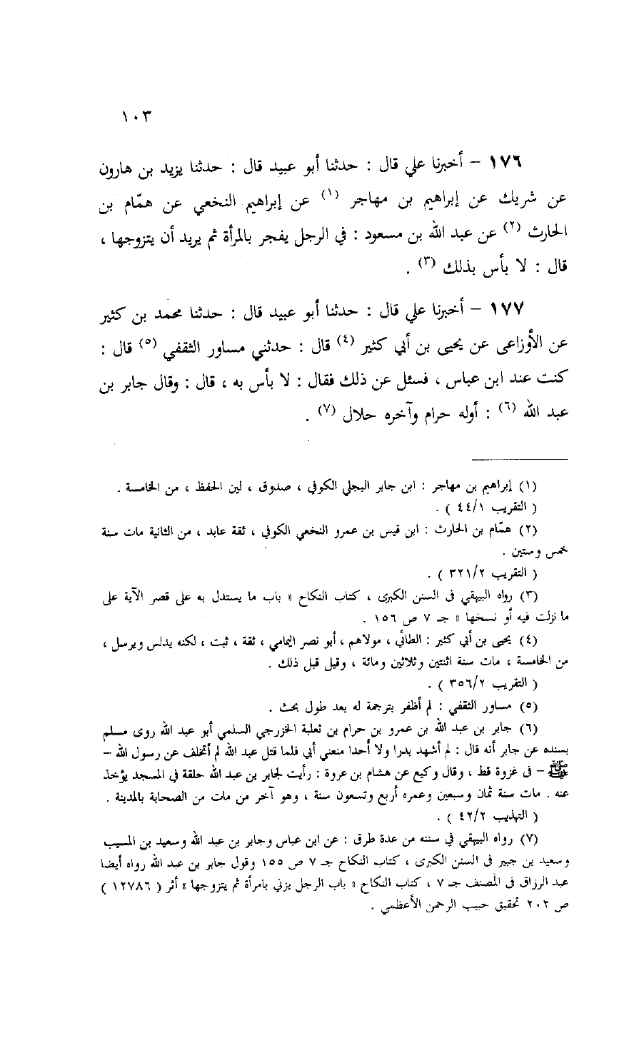 (¬7) رواه البيهقي في سننه من عدة طرق: عن ابن عباس وجابر بن عبد الله وسعيد بن المسيب وسعيد بن جبير فى السنن الكبرى، كتاب النكاح ج 7 ص 155 وقول جابر بن عبد الله رواه أيضا عبد الرزاق فى المصنف ج 7، كتاب النكاح «باب الرجل يزني بامرأة ثم يتزوجها» أثر (12786) ص 202 تحقيق حبيب الرحمن الأعظمي.